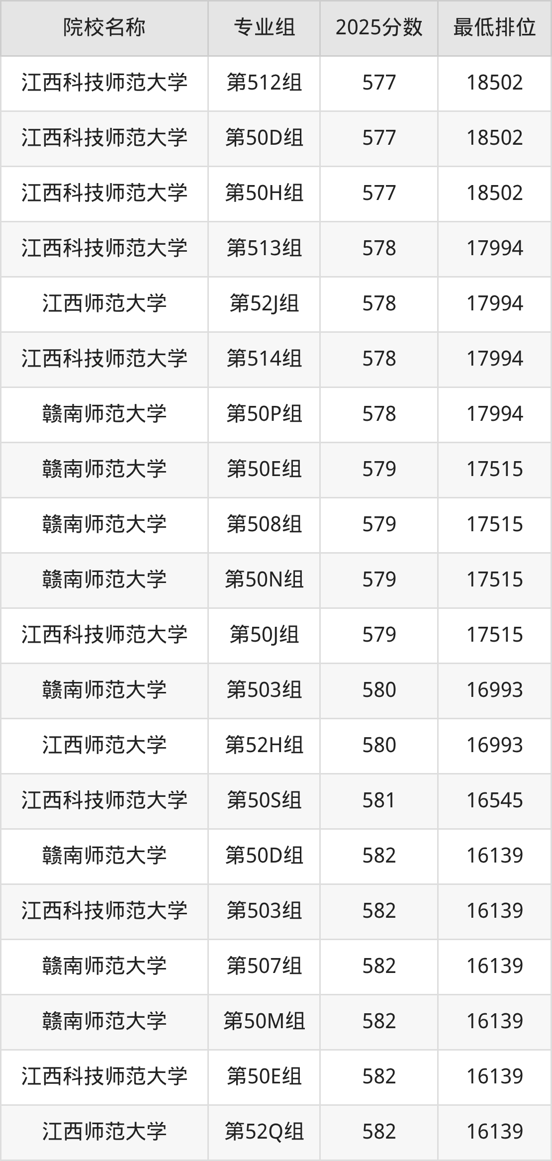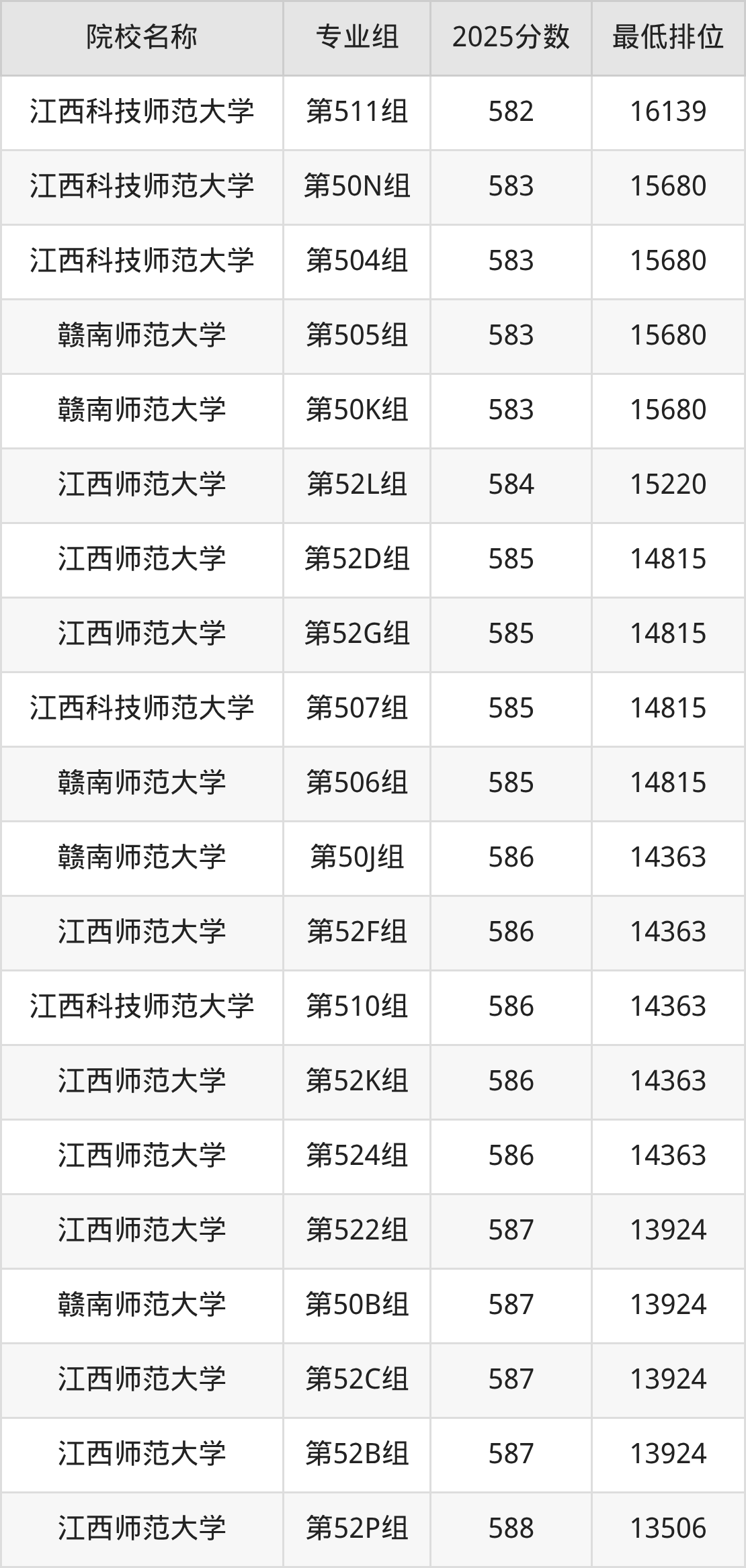 第二梯队(581-599分):江西科技师范大学(第50S组是581分)、赣南师范大学(第50D组是582分)、江西科技师范大学(第503组是582分)、赣南师范大学(第507组是582分)