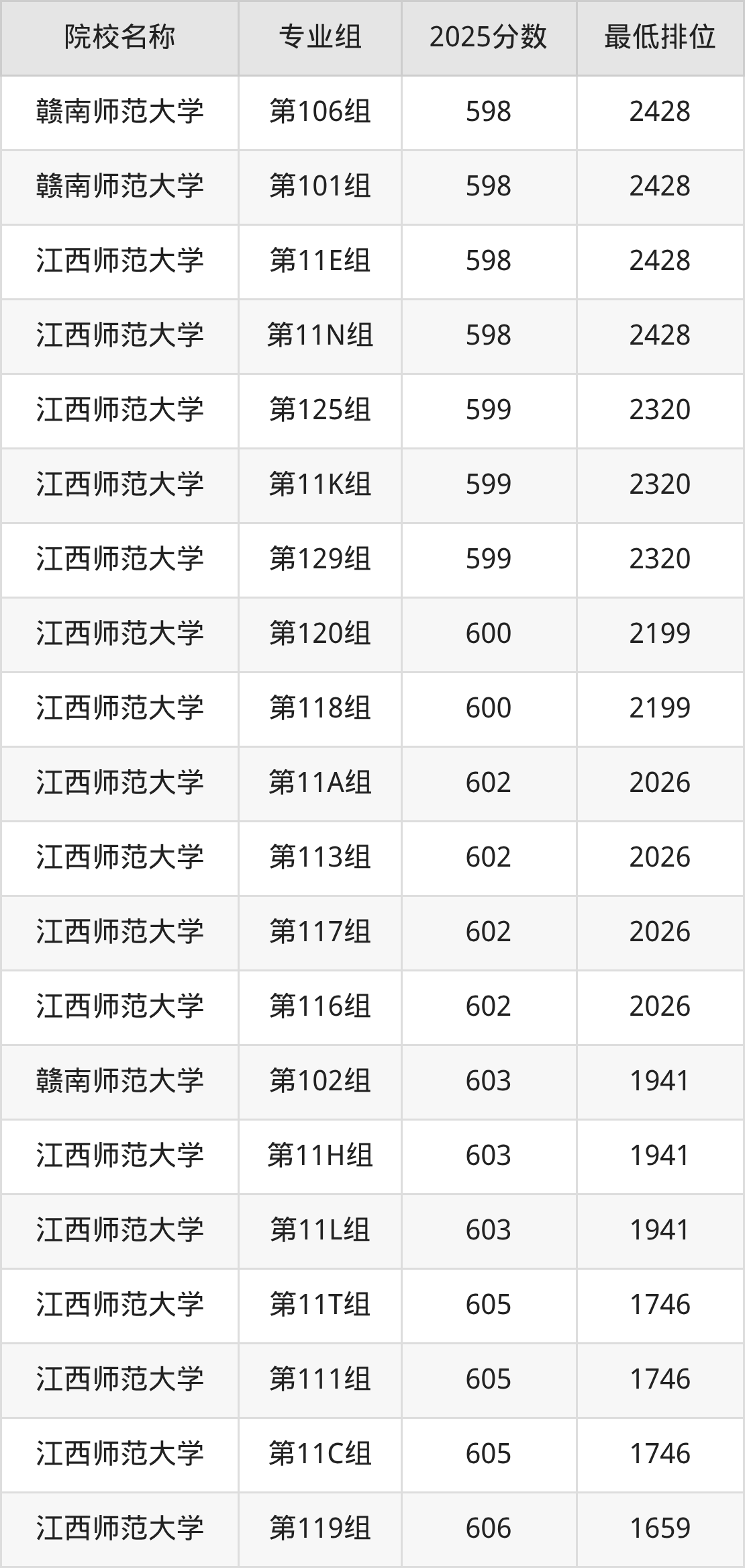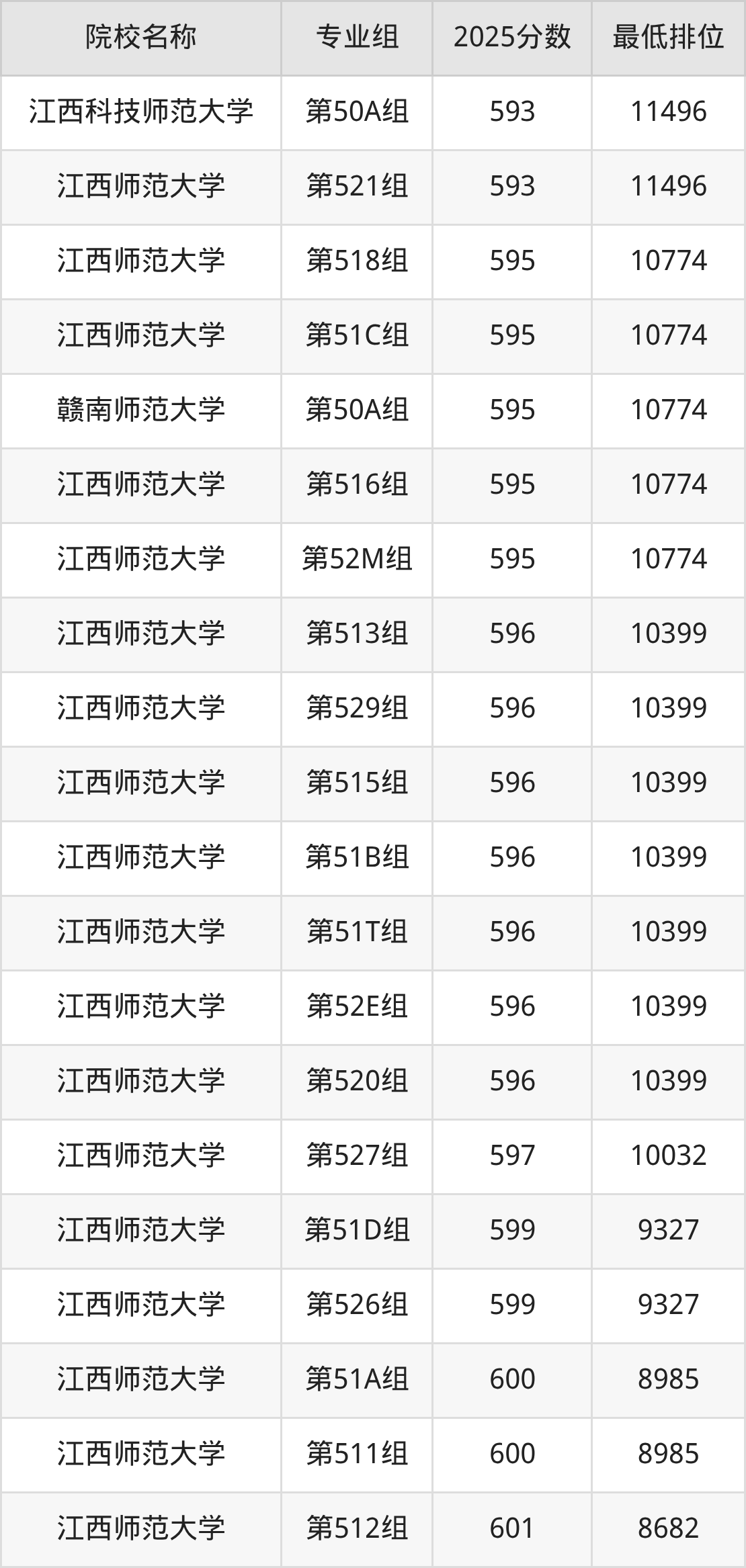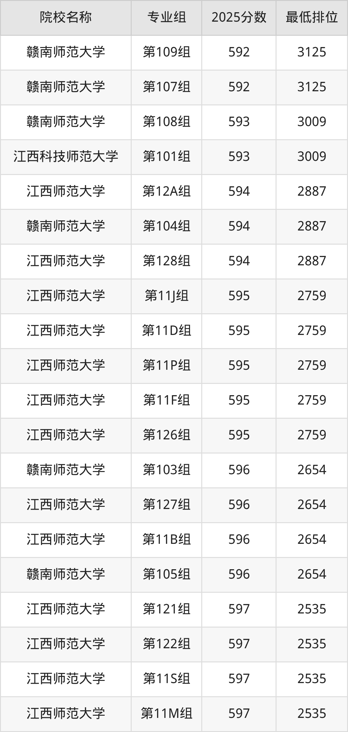 第三梯队(600分及以下):赣南师范大学(第109组是592分)、赣南师范大学(第107组是592分)、赣南师范大学(第108组是593分)、江西科技师范大学(第101组是593分)