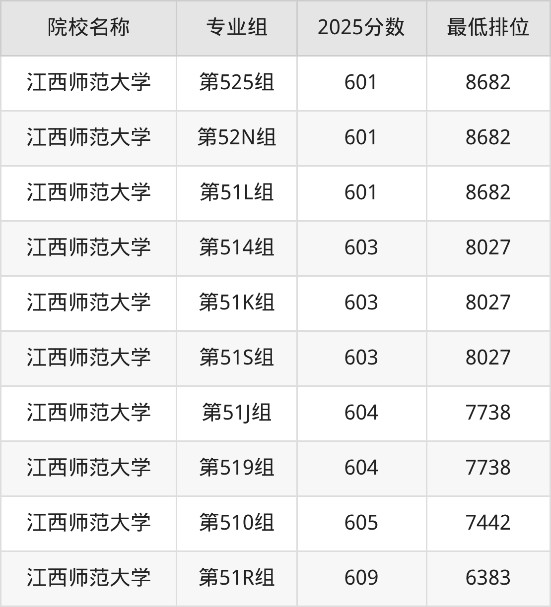 第二梯队(601-609分):江西师范大学(第11A组是602分)、江西师范大学(第113组是602分)、江西师范大学(第117组是602分)、江西师范大学(第116组是602分)