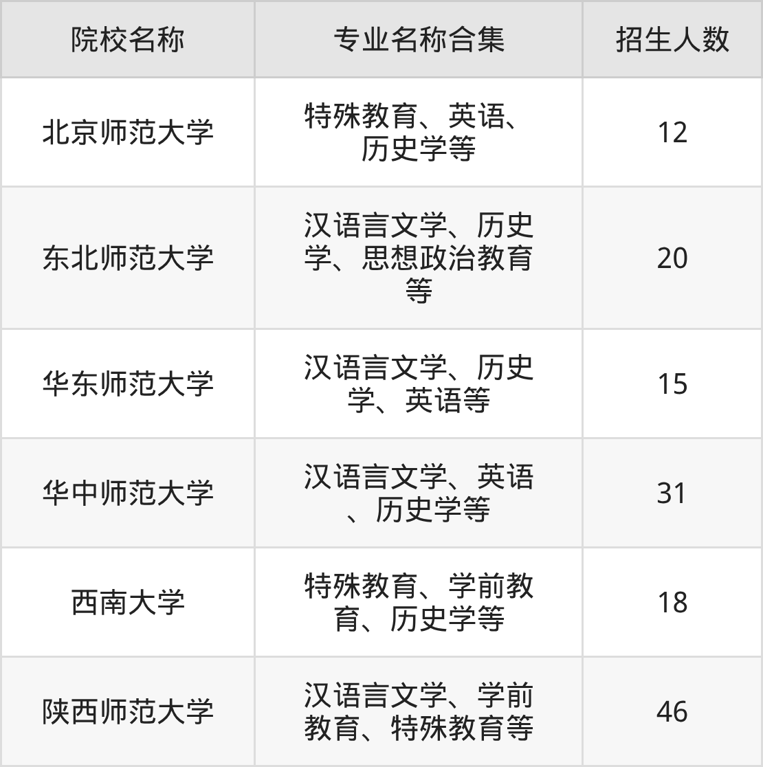 其中,陕西师范大学以46人招生规模居首,华中师范大学31人紧随其后,东北师范大学招20人,构成招生第一梯队。