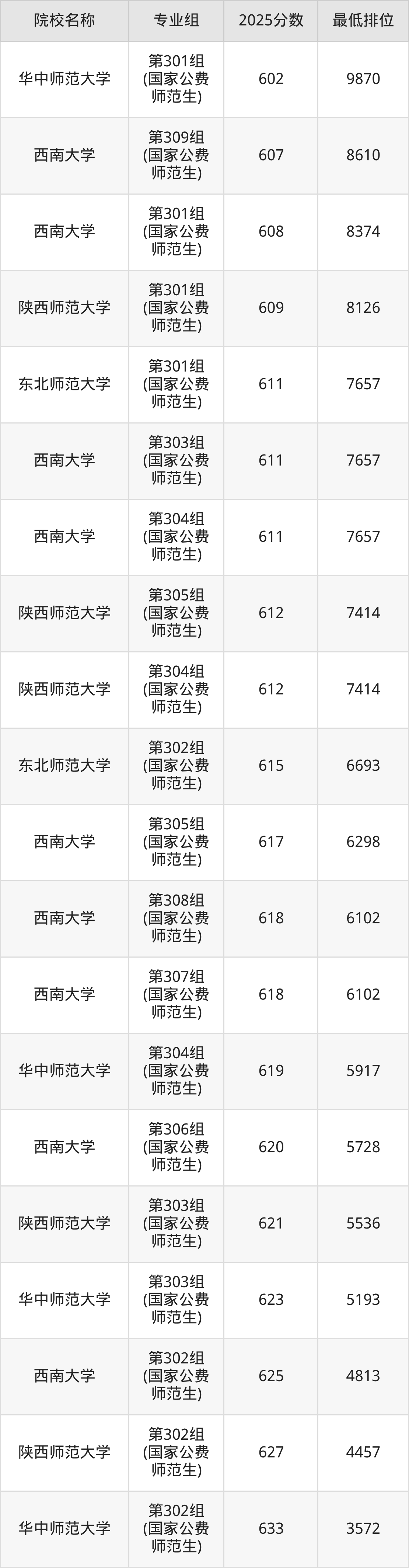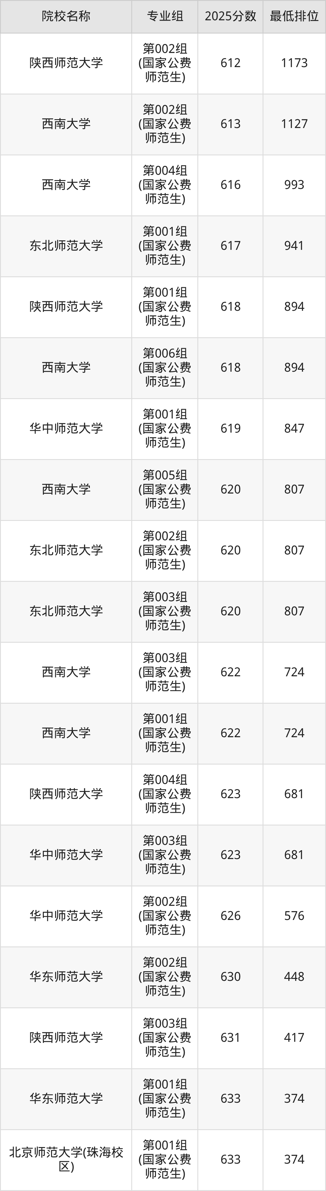 第一梯队(630分+):华东师范大学(第002组(国家公费师范生)是630分)、陕西师范大学(第003组(国家公费师范生)是631分)、华东师范大学(第001组(国家公费师范生)是633分)、北京师范大学(珠海校区)(第001组(国家公费师范生)是633分)