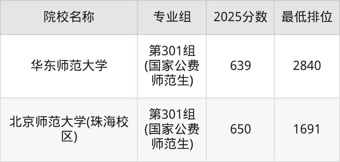 第一梯队(650分+):北京师范大学(珠海校区)(第301组(国家公费师范生)是650分)