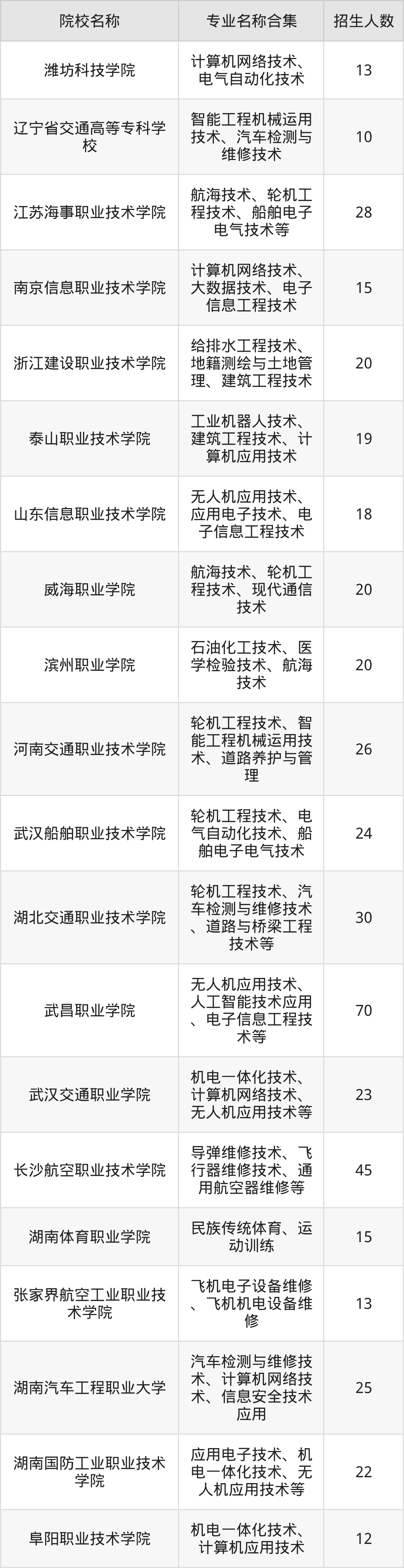 湖南:长沙航空职业技术学院、湖南体育职业学院、张家界航空工业职业技术学院、湖南汽车工程职业大学、湖南国防工业职业技术学院