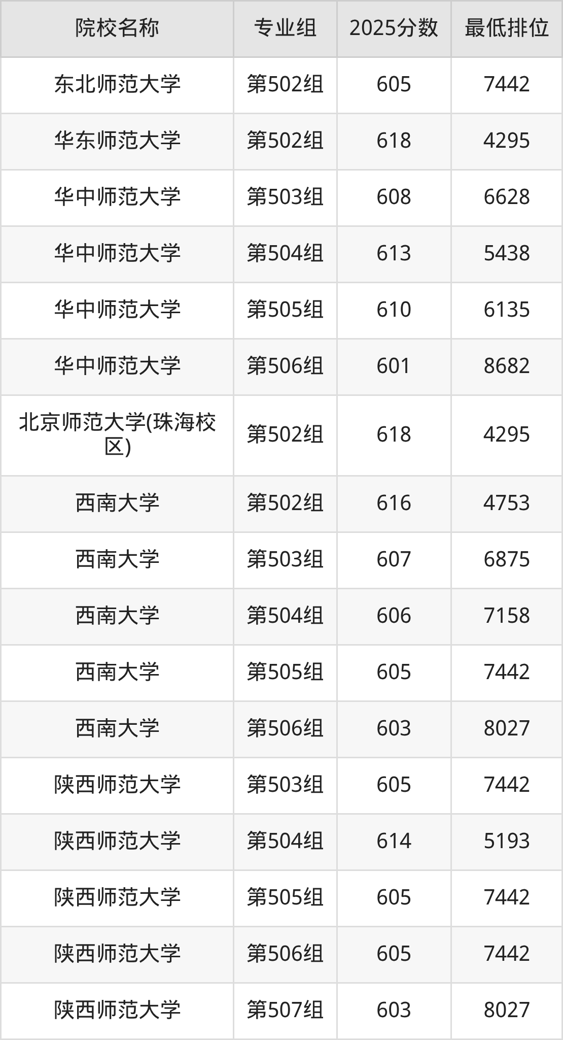 第二梯队(610分及以下):东北师范大学(第502组是605分)、华中师范大学(第503组是608分)、华中师范大学(第505组是610分)、华中师范大学(第506组是601分)