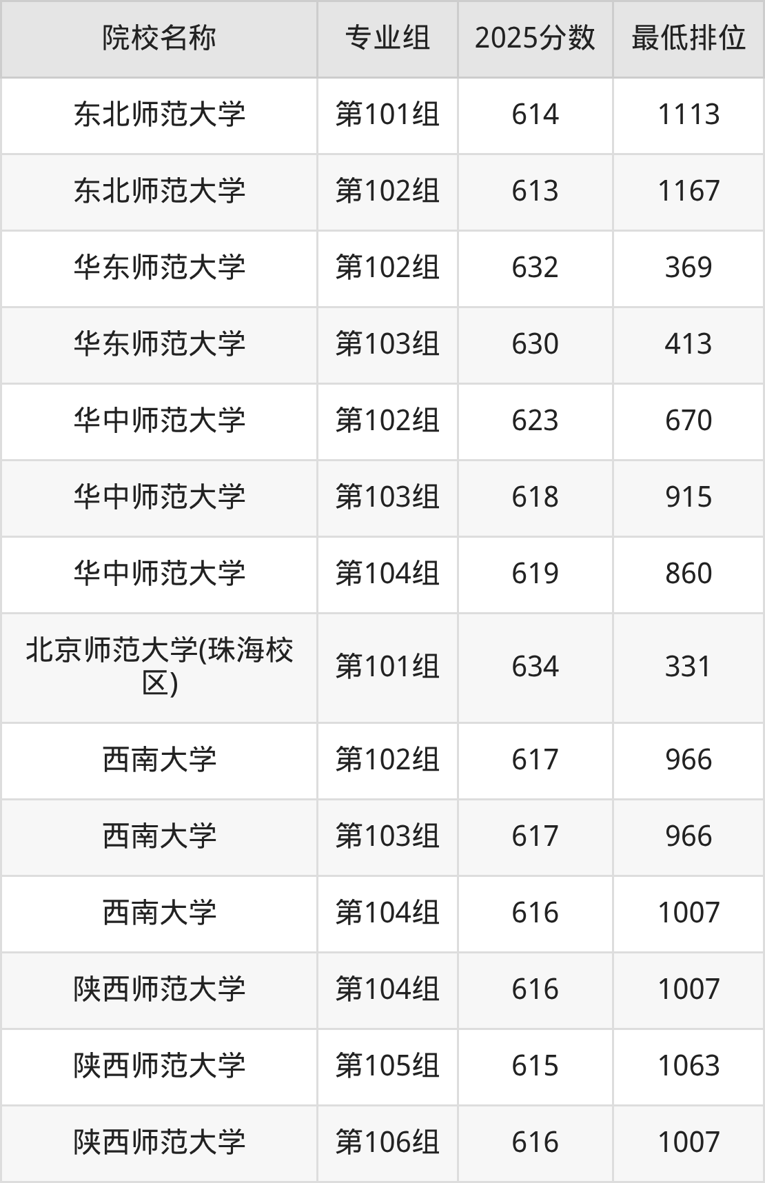 第一梯队(630分+):华东师范大学(第102组是632分)、华东师范大学(第103组是630分)、北京师范大学(珠海校区)(第101组是634分)