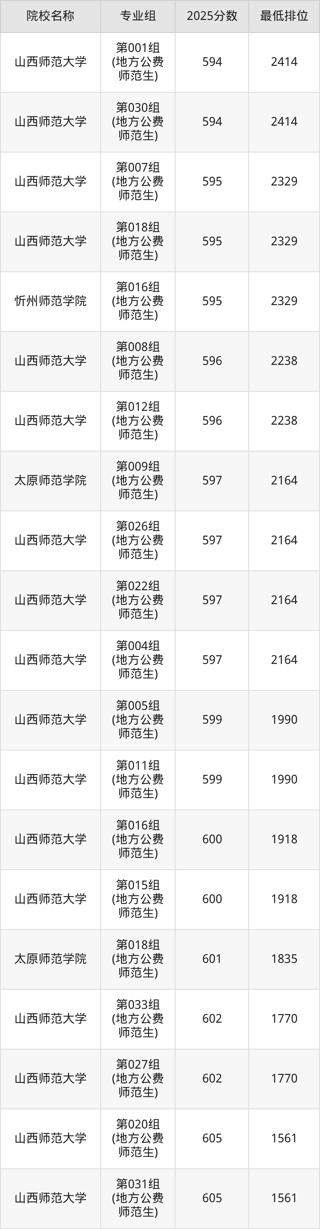 第一梯队(600分+):山西师范大学(第016组(地方公费师范生)是600分)、山西师范大学(第015组(地方公费师范生)是600分)、太原师范学院(第018组(地方公费师范生)是601分)、山西师范大学(第033组(地方公费师范生)是602分)