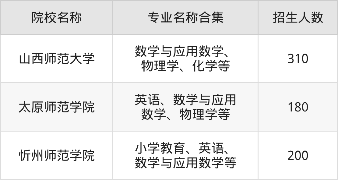 其中,山西师范大学以310人招生规模居首,忻州师范学院200人紧随其后,太原师范学院招180人。
