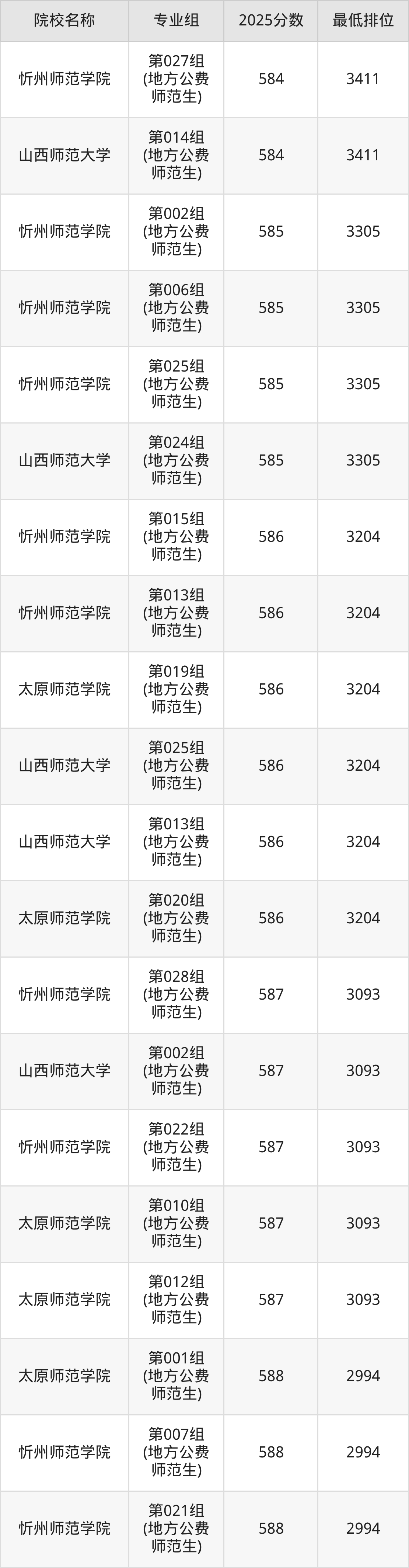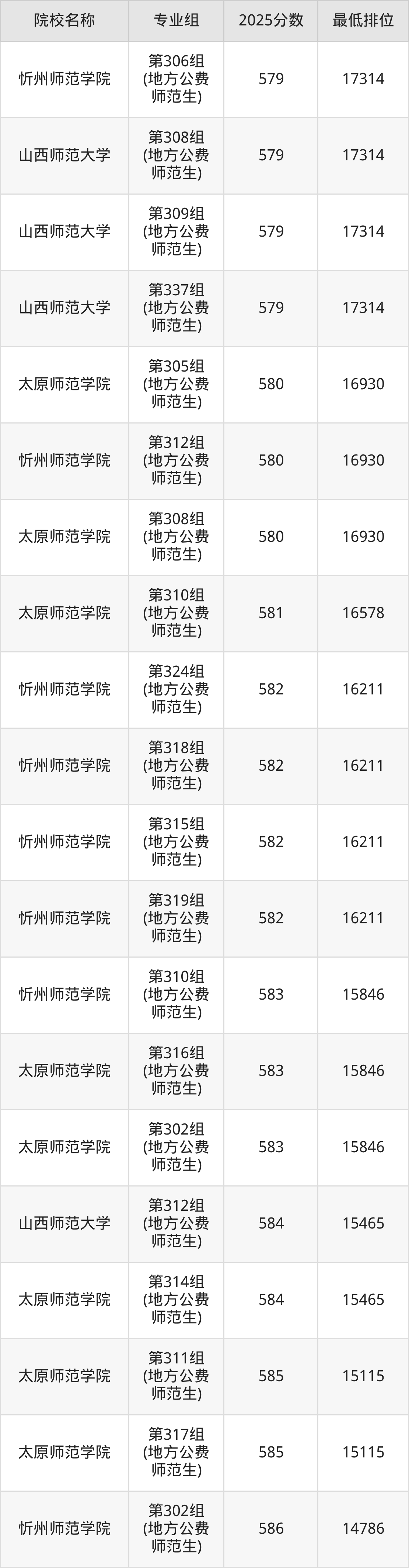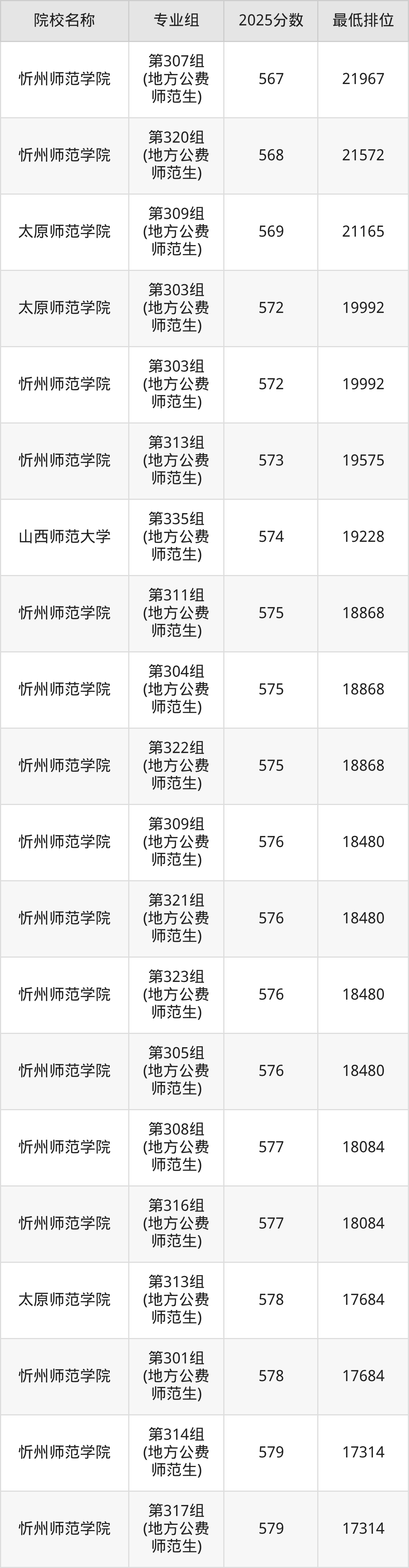 第二梯队(571-599分):太原师范学院(第303组(地方公费师范生)是572分)、忻州师范学院(第303组(地方公费师范生)是572分)、忻州师范学院(第313组(地方公费师范生)是573分)、山西师范大学(第335组(地方公费师范生)是574分)