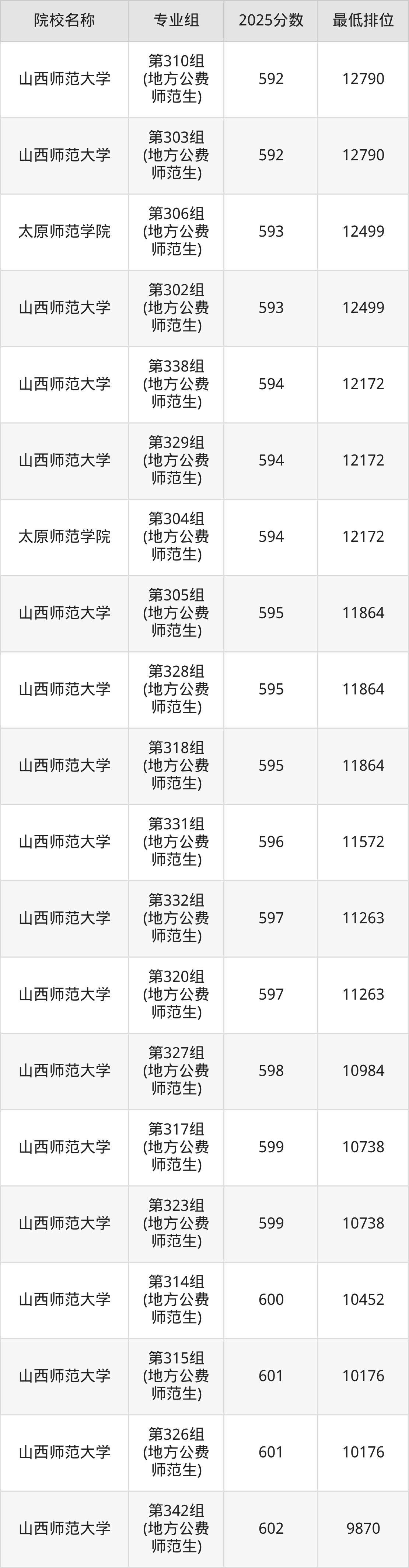 2025年在山西高考共计3所地方公费师范生院校招生,这些院校均为省内高校,包含山西师范大学、太原师范学院、忻州师范学院。再看山西地方公费师范生大学2025年录取分数线,物理类最低分区间是567至607分,历史类最低分区间是571至608分,2026届有意报考的同学请参考!