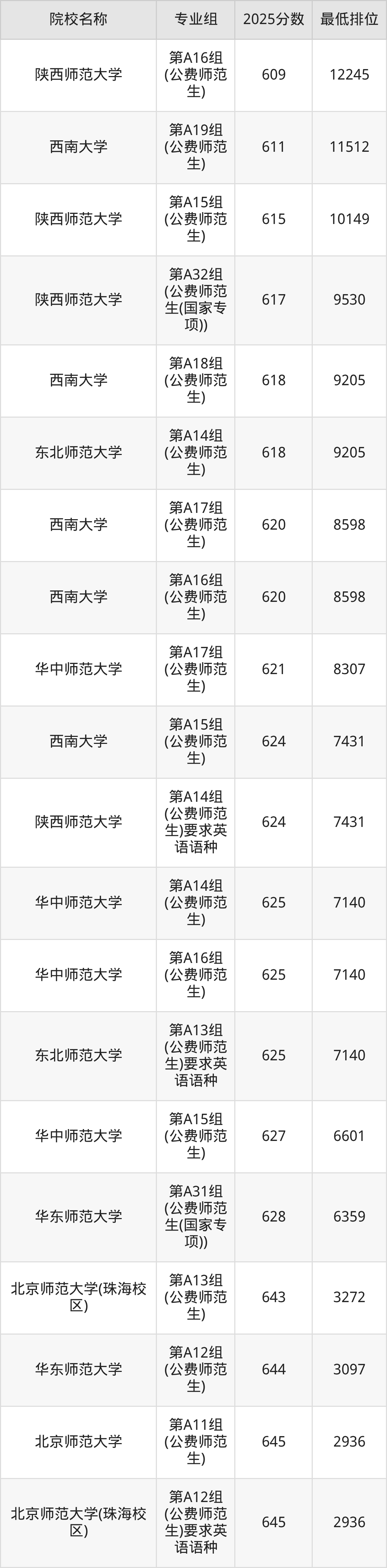 第一梯队(640分+):北京师范大学(珠海校区)(第A13组(公费师范生)是643分)、华东师范大学(第A12组(公费师范生)是644分)、北京师范大学(第A11组(公费师范生)是645分)、北京师范大学(珠海校区)(第A12组(公费师范生)是645分)