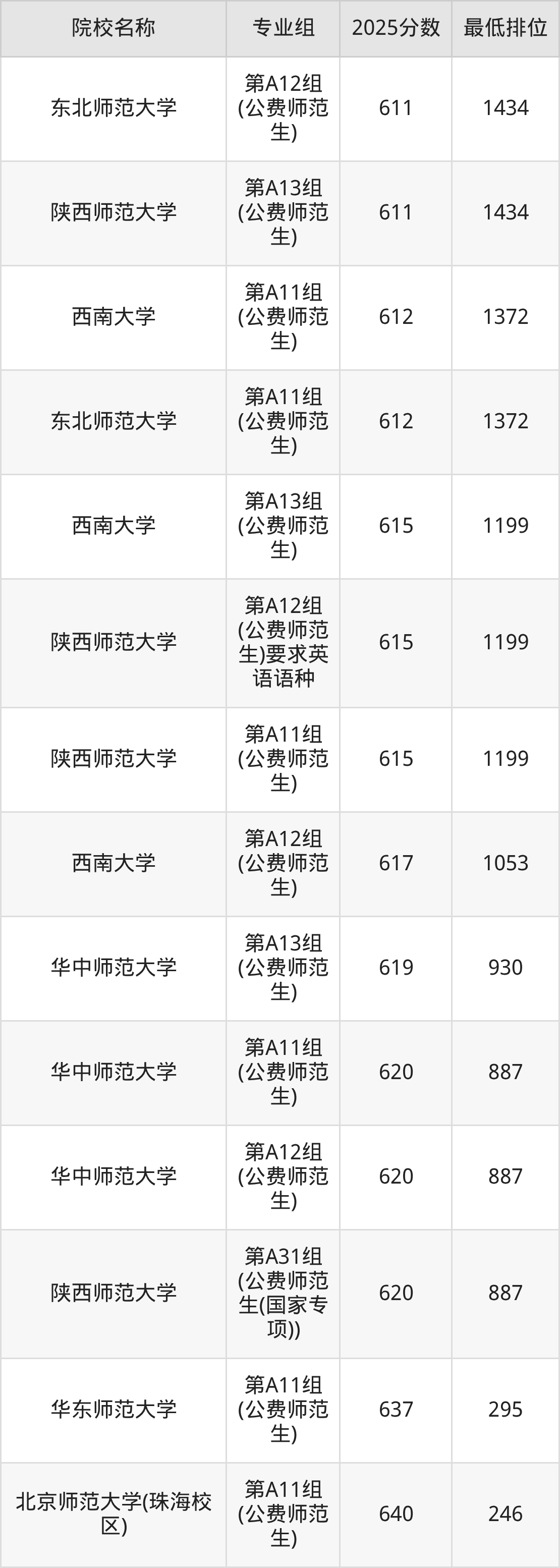 第三梯队(620分及以下):东北师范大学(第A12组(公费师范生)是611分)、陕西师范大学(第A13组(公费师范生)是611分)、西南大学(第A11组(公费师范生)是612分)、东北师范大学(第A11组(公费师范生)是612分)
