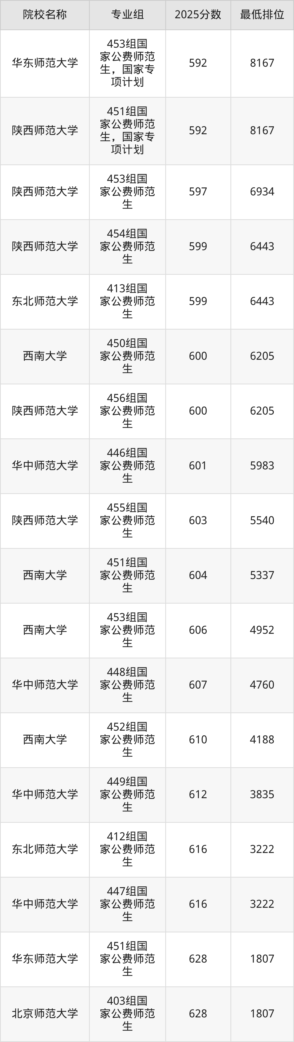 2025年在广西高考共计6所国家公费师范生院校招生,这些院校均为省外高校,包含北京师范大学、东北师范大学、华东师范大学等。再看广西国家公费师范生大学2025年录取分数线,物理类最低分区间是592至628分,历史类最低分区间是602至625分,2026届有意报考的同学请参考!