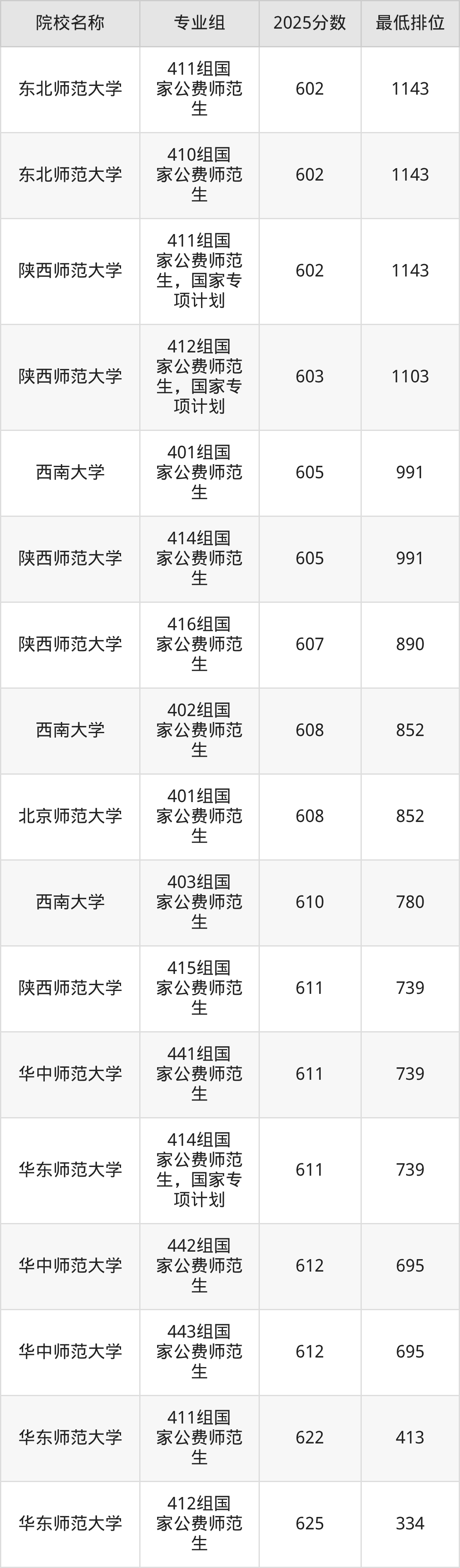 附国家公费师范生院校2025年在广西高考历史类的录取分数线一览表: