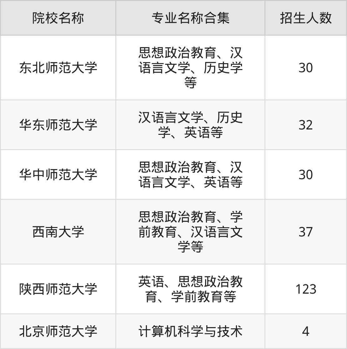 其中,陕西师范大学以123人招生规模居首,西南大学37人紧随其后,华东师范大学招32人,构成招生第一梯队。