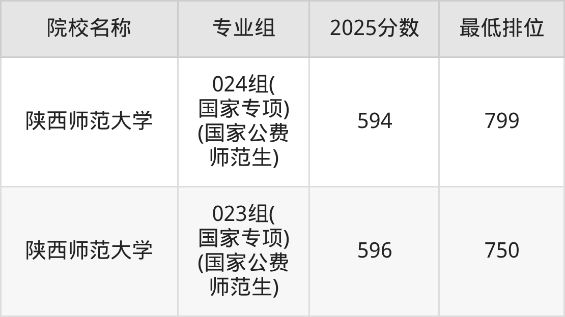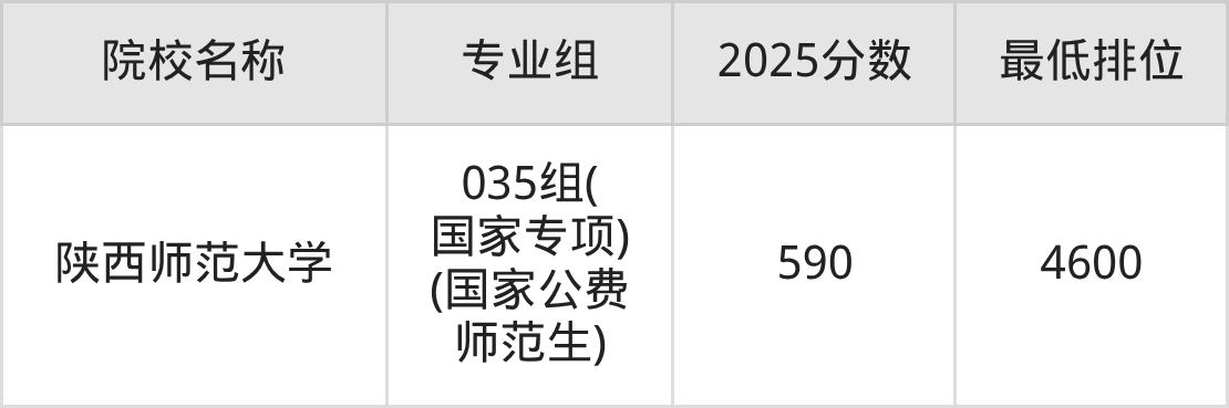 2025年投档数据显示,甘肃高考国家公费师范生物理类投档线最高590分(位次4600)(陕西师范大学035组(国家专项)(国家公费师范生)),超特控线115分;历史类最高596分(位次750)(陕西师范大学023组(国家专项)(国家公费师范生)),超特控线96分。