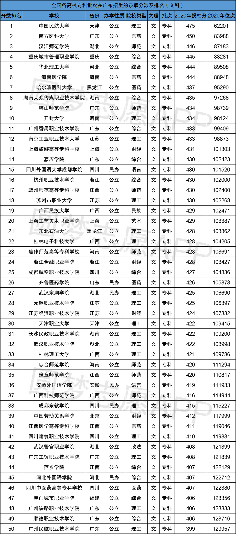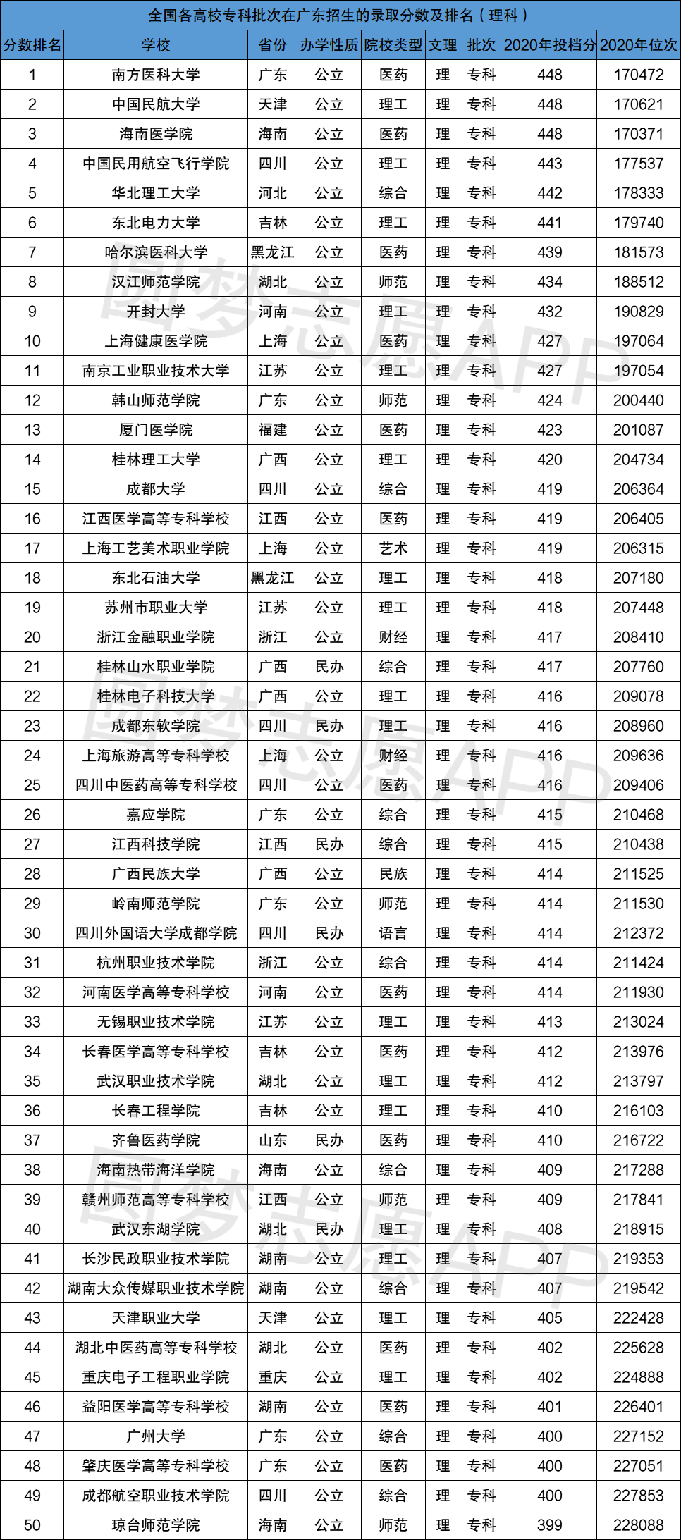 根据广东教育考试院公布的数据,将各专科院校在广东省2020年高考录取分数进行整理及排名。由于专科院校较多,小编只筛选了2020年在广东省招生排名前50的院校,供大家参考: