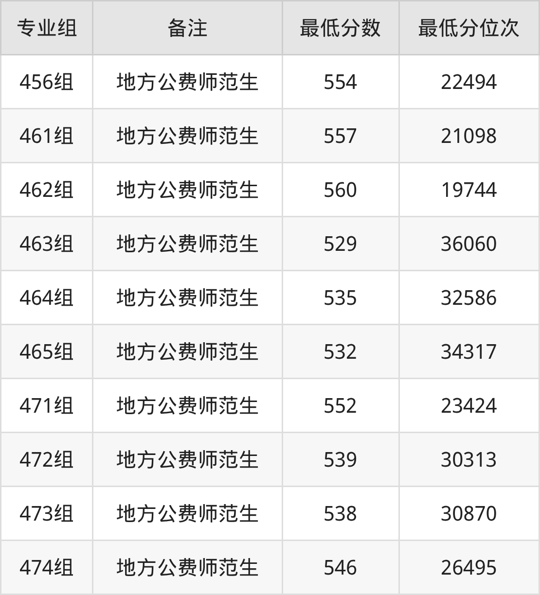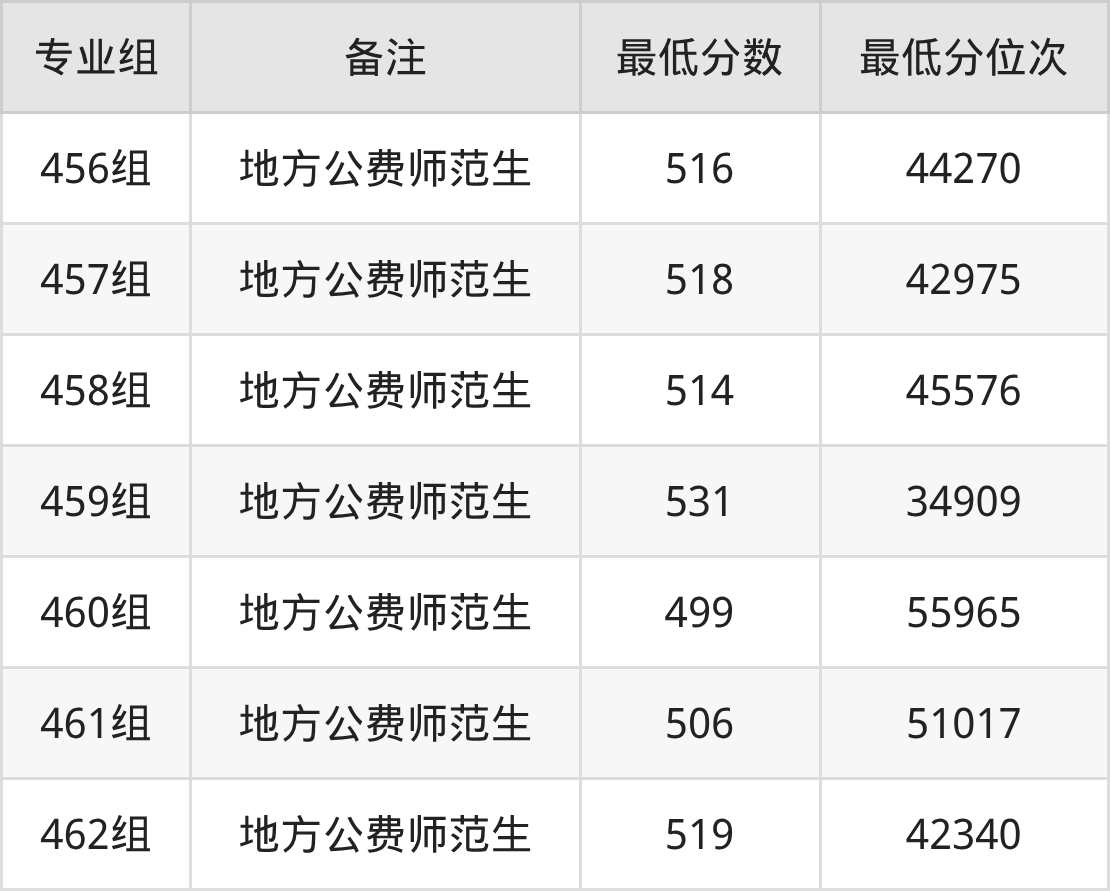 (4)广西民族师范学院:460组录取分是519、位次是42340,461组录取分是551、位次是23956,462组录取分是534、位次是33124,463组录取分是498、位次是56685,464组录取分是509、位次是48974