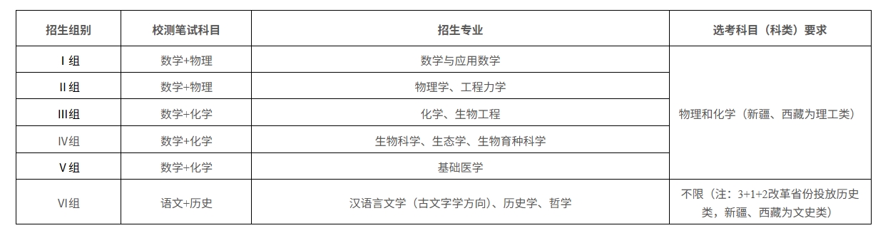 所有招生专业均要求选考物理+化学,包含数学类、物理学类、化学、生物科学类、理论与应用力学、核工程类、地球物理学等专业,完整情况如下: