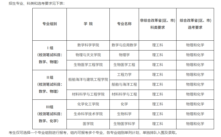 数学与应用数学、物理学、生物医学工程、工程力学、船舶与海洋工程、材料科学与工程、化学、生物科学、生物医学科学,所有招生专业均要求选考物理+化学。