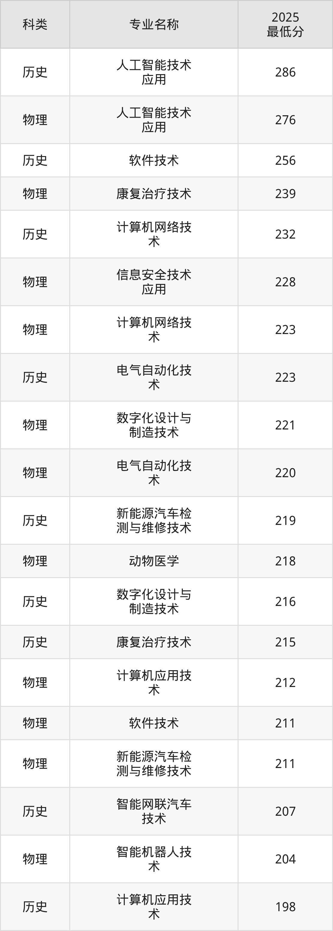 2025年长春数字科技职业学院专业录取分数线排名最高的是人工智能技术应用(历史类286分),分数线排名最低的是城市轨道车辆应用技术(物理类170分)。