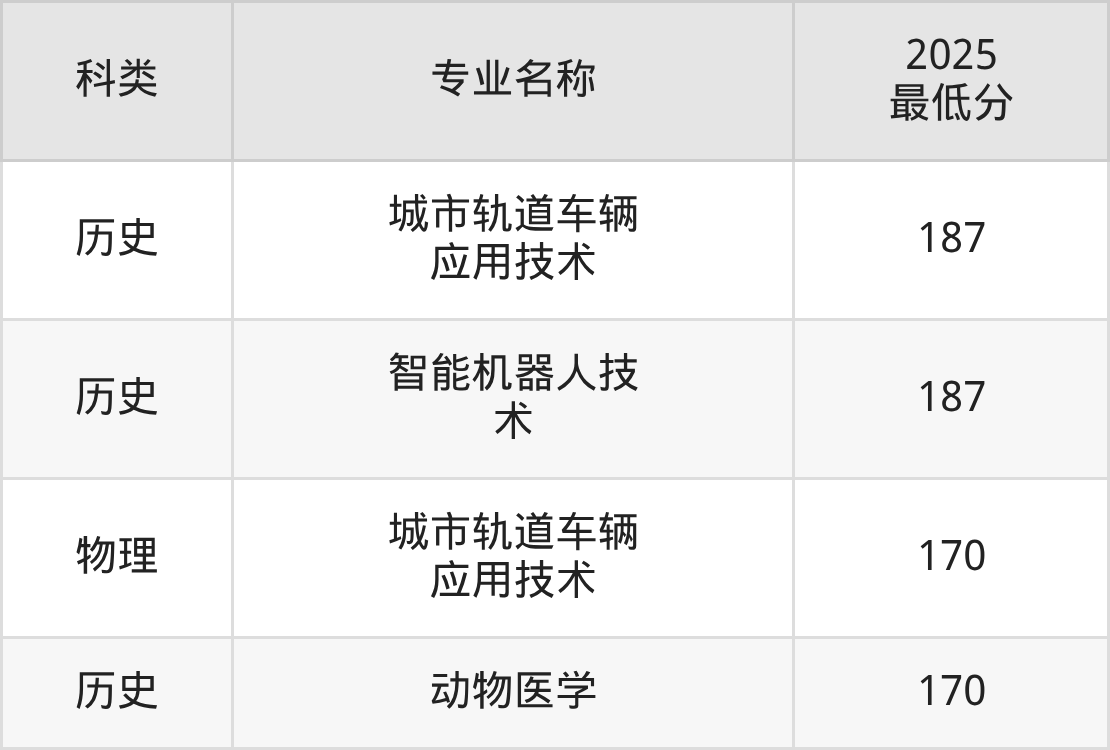 2025年长春数字科技职业学院各专业在吉林招生分数范围为170分-286分,其中物理类分数最低、最好考的专业是城市轨道车辆应用技术专业(170分),最低分超专科线10分;历史类分数最低、最好考的专业是动物医学专业(170分),最低分超专科线10分。