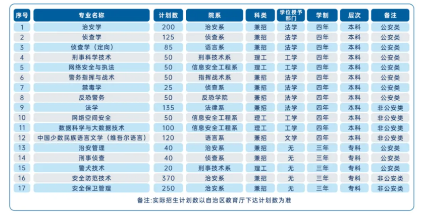 本科(16个):治安学、侦查学、侦查学(维吾尔语方向)、网络安全与执法、刑事科学技术、警务指挥与战术、禁毒学、反恐警务、法学、数据科学与大数据技术、网络空间安全、中国少数民族语言文学(维吾尔语言)