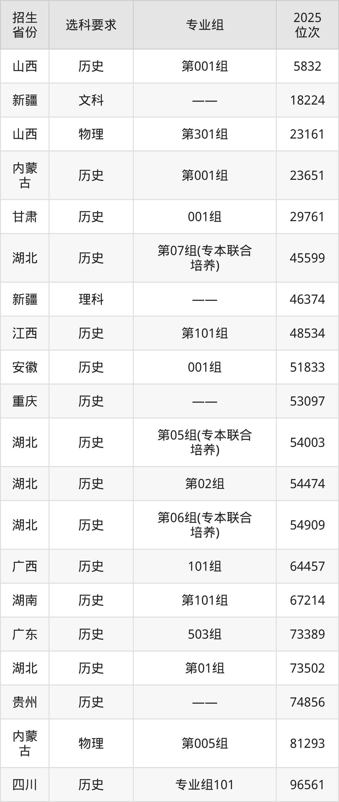 黄冈职业技术大学2025年在全国各省的位次差异较大,最高位次是5832位(山西历史类)、最低位次是332751位(山东)。各省具体位次请看下图: