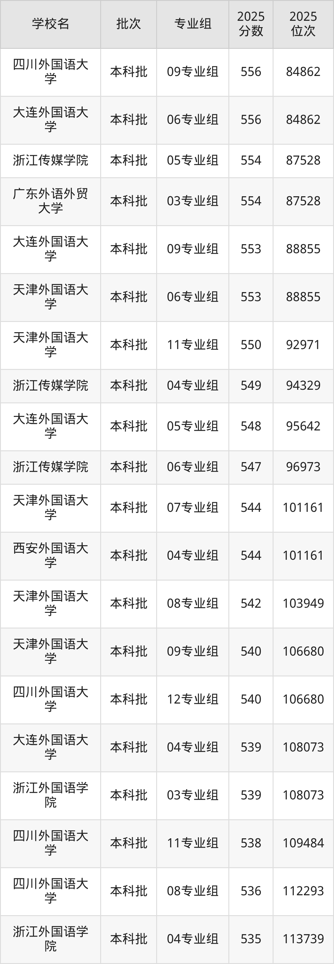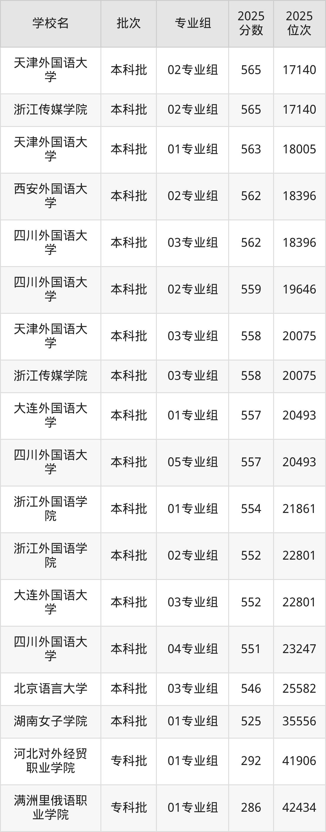 以下为2025年全国公办语言类大学在江苏省物理类招生录取分数线: