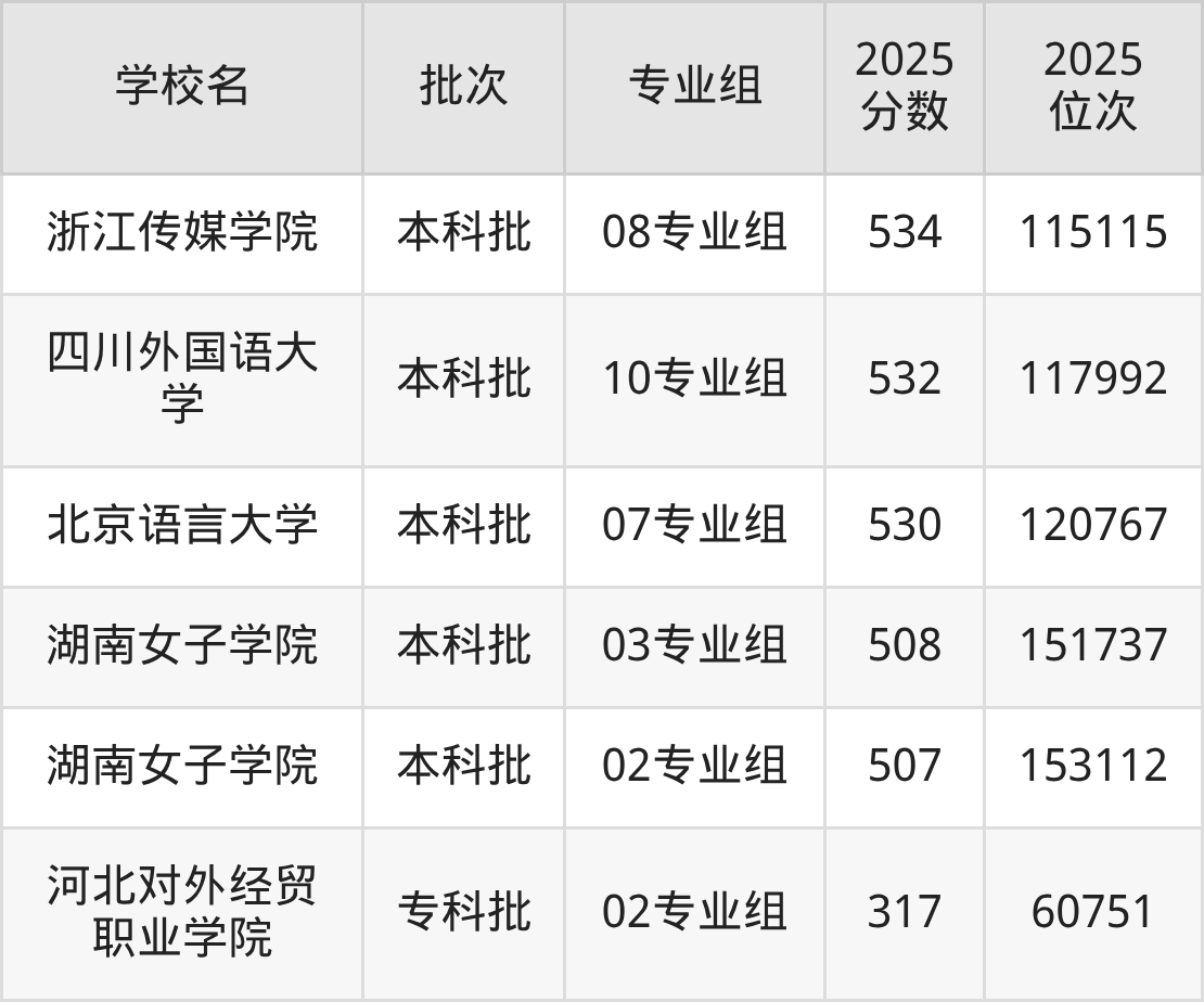 以下为2025年全国公办语言类大学在江苏省历史类招生录取分数线: