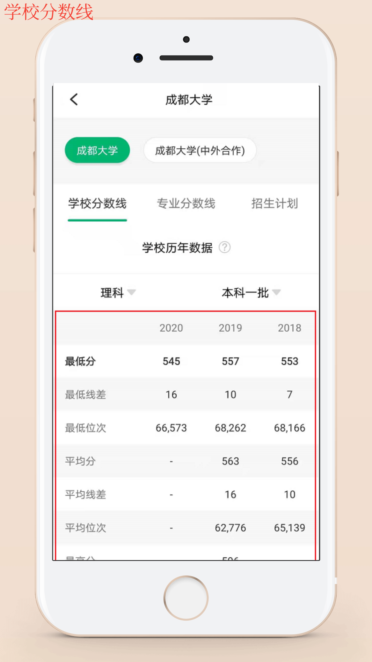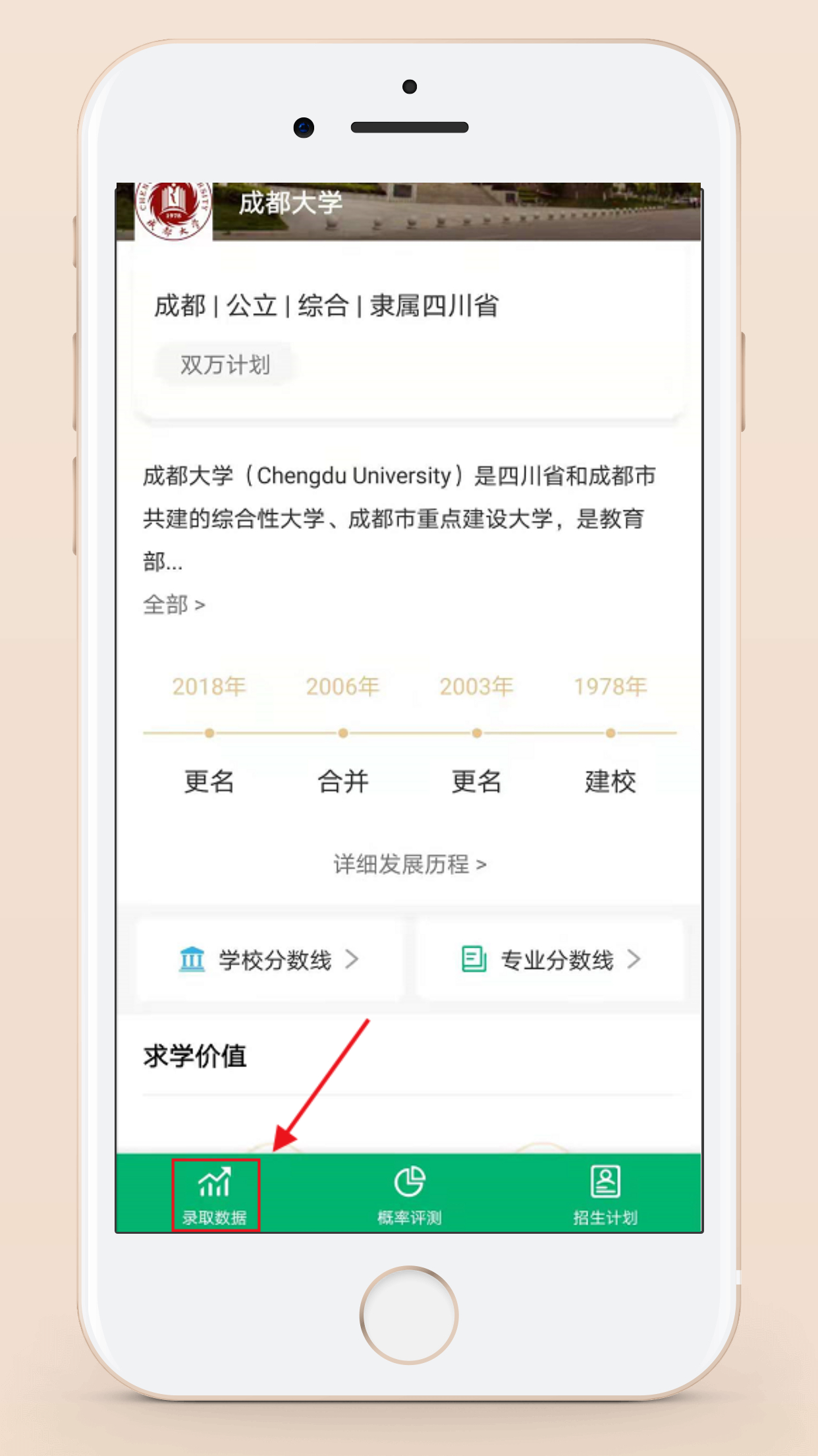 第三步:点击大学详情页左下角的“录取数据”功能。