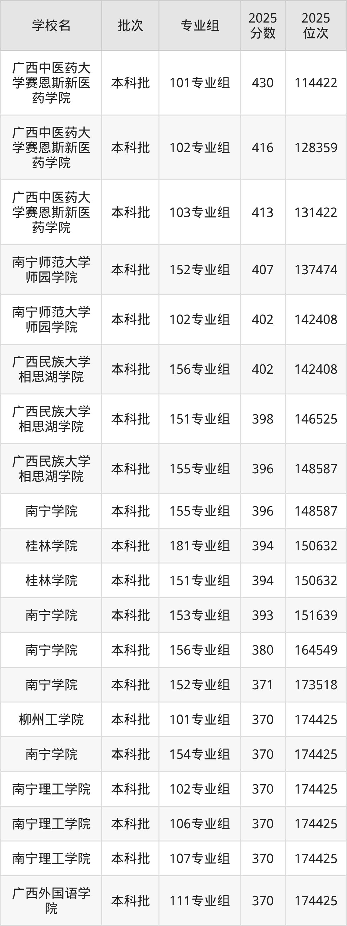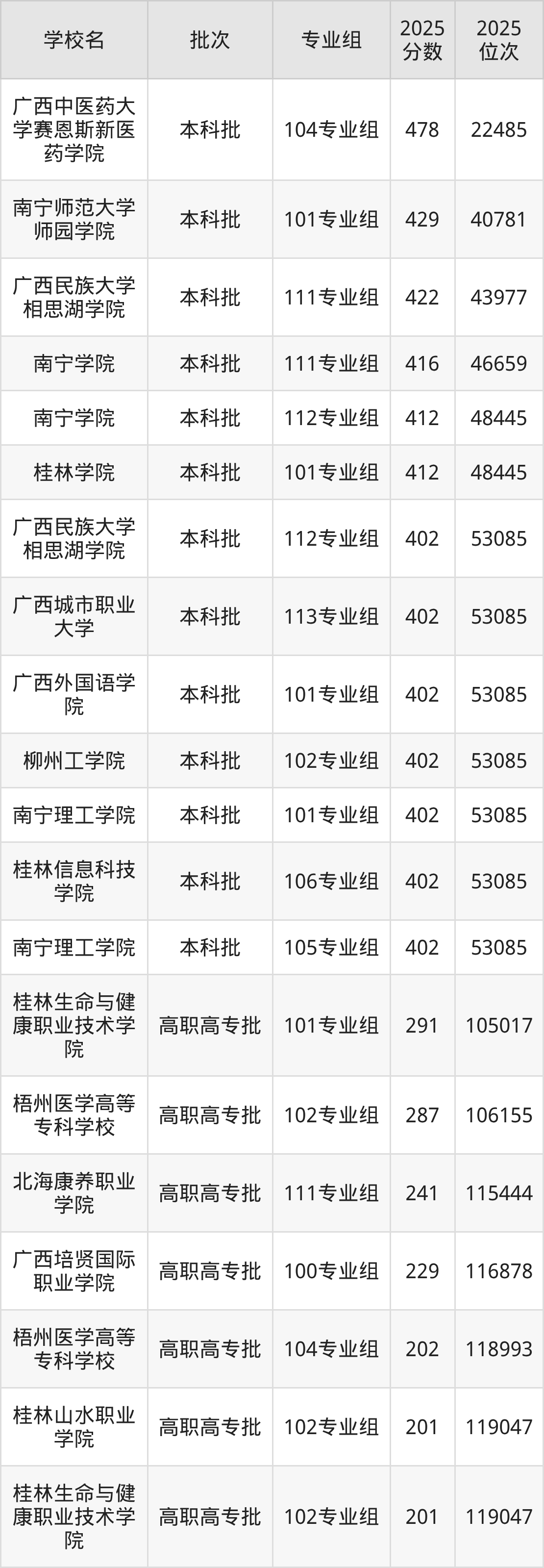 以下为2025年广西壮族自治区内物理类所有民办大学分数线: