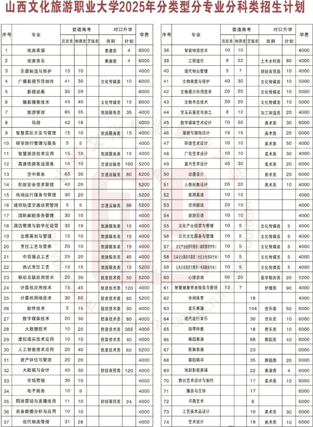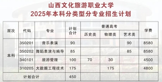 山西文化旅游职业大学以山西艺术职业学院、山西青年职业学院、太原旅游职业学院、山西旅游职业学院为建校基础设立。参考2025年招生简章,首批本科招生专业有大数据工程技术、旅游管理、音乐表演等,该校在山西省本科批历史类最低477分、物理类最低441分。