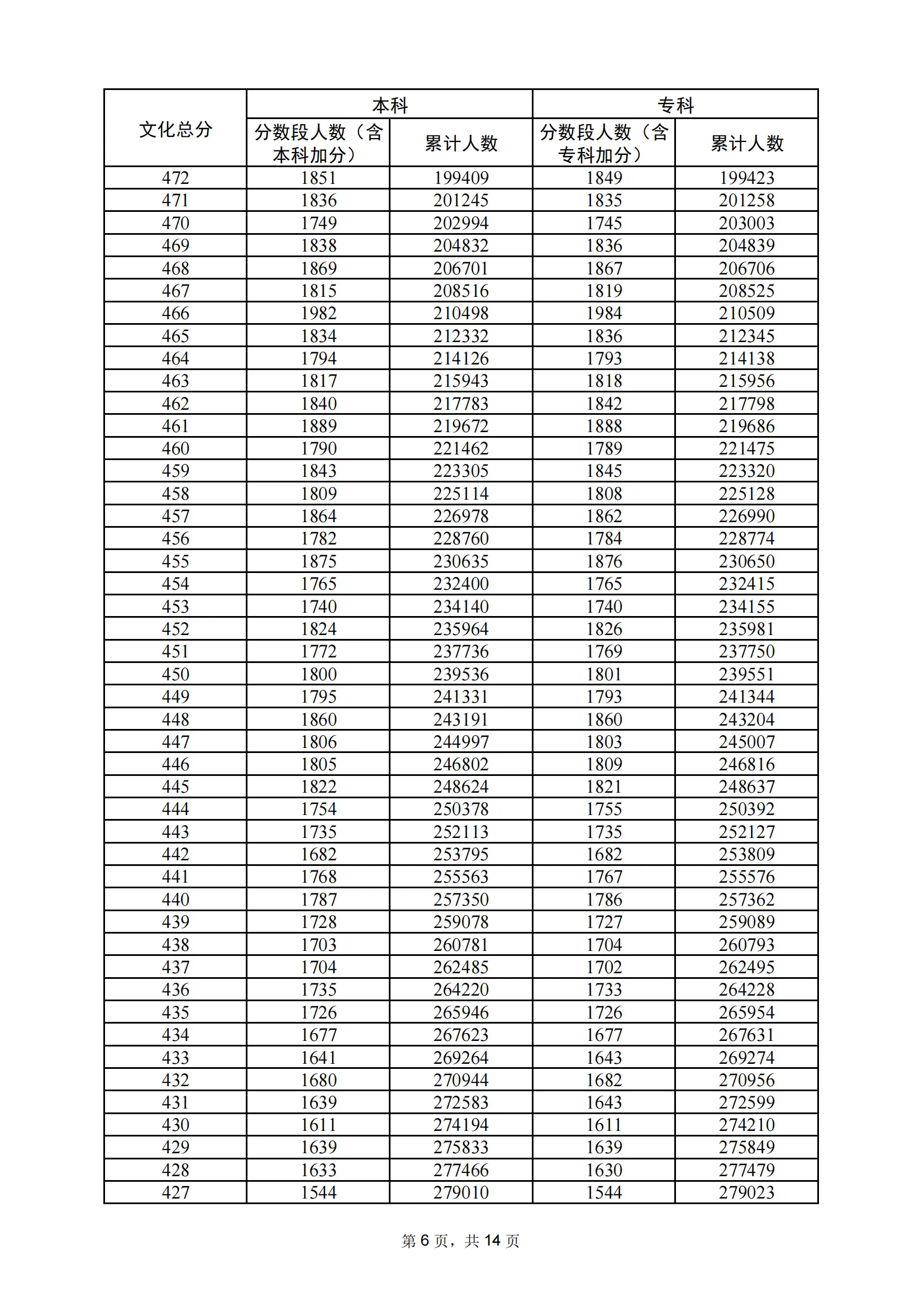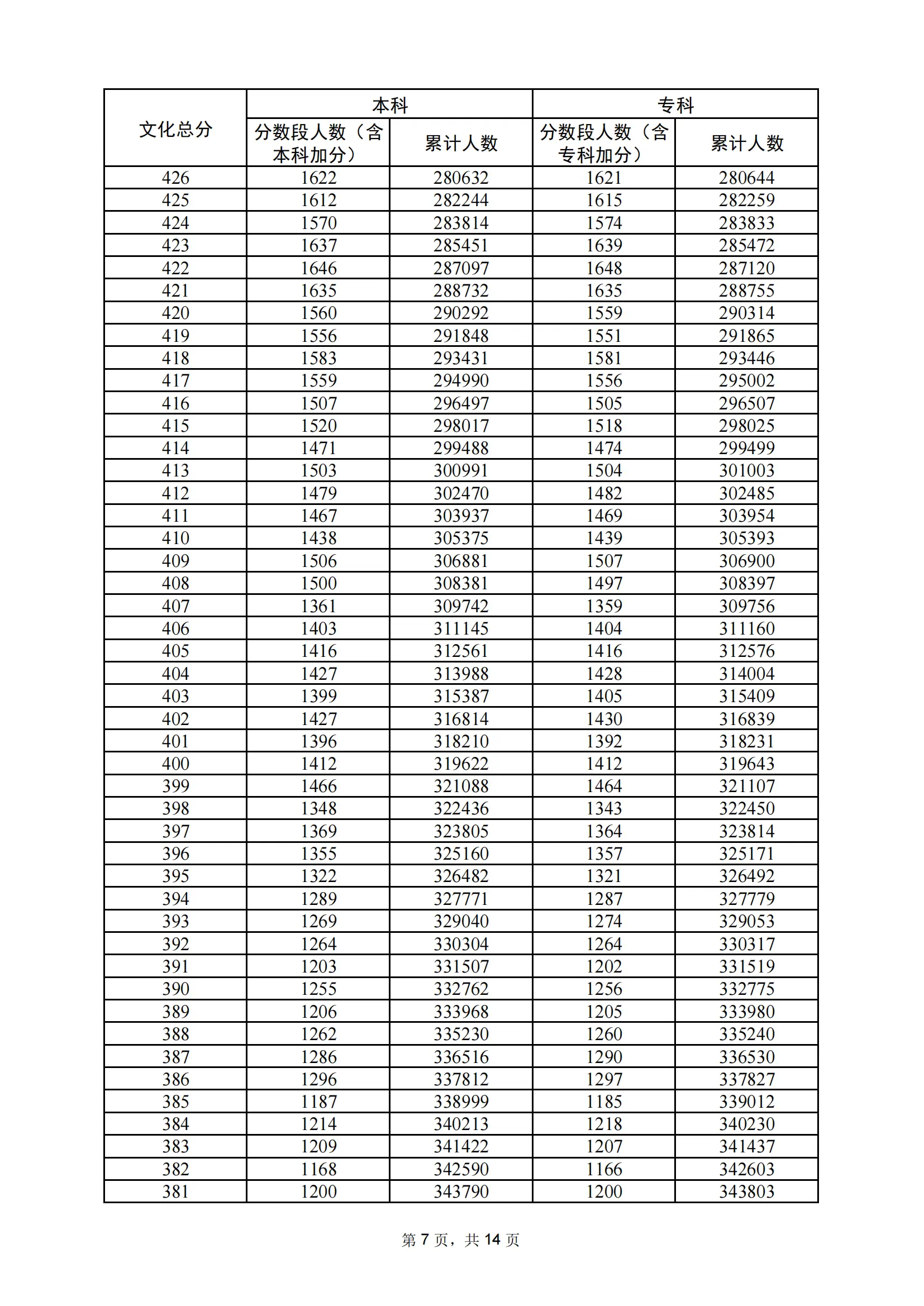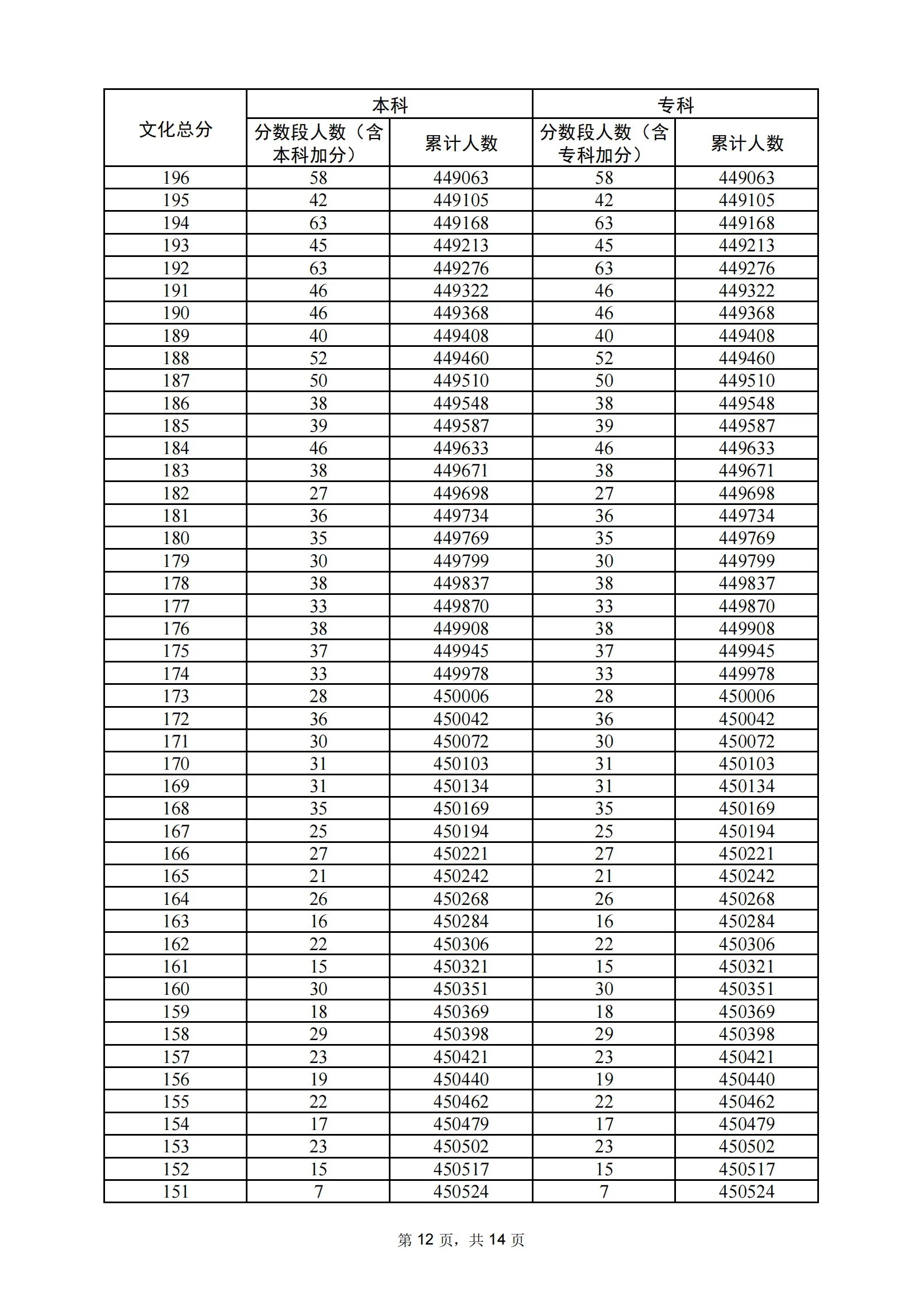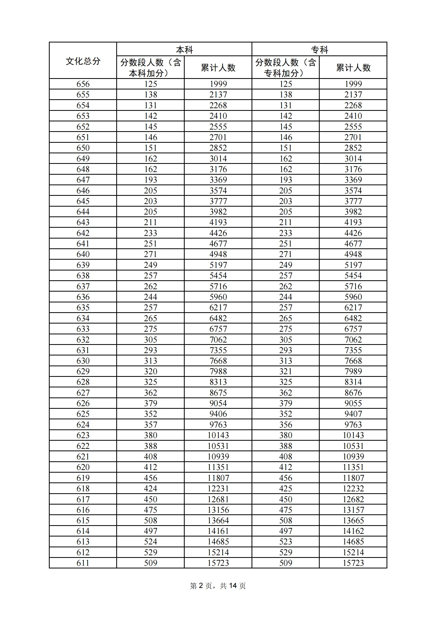 | 年份 | 分数 | 人数 | 累计人数 |
