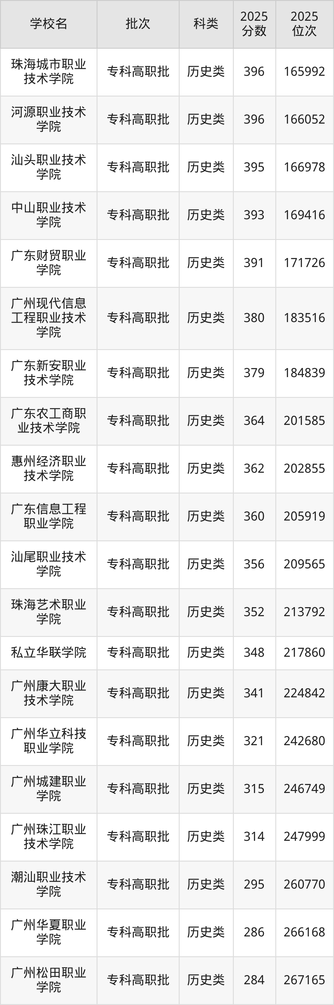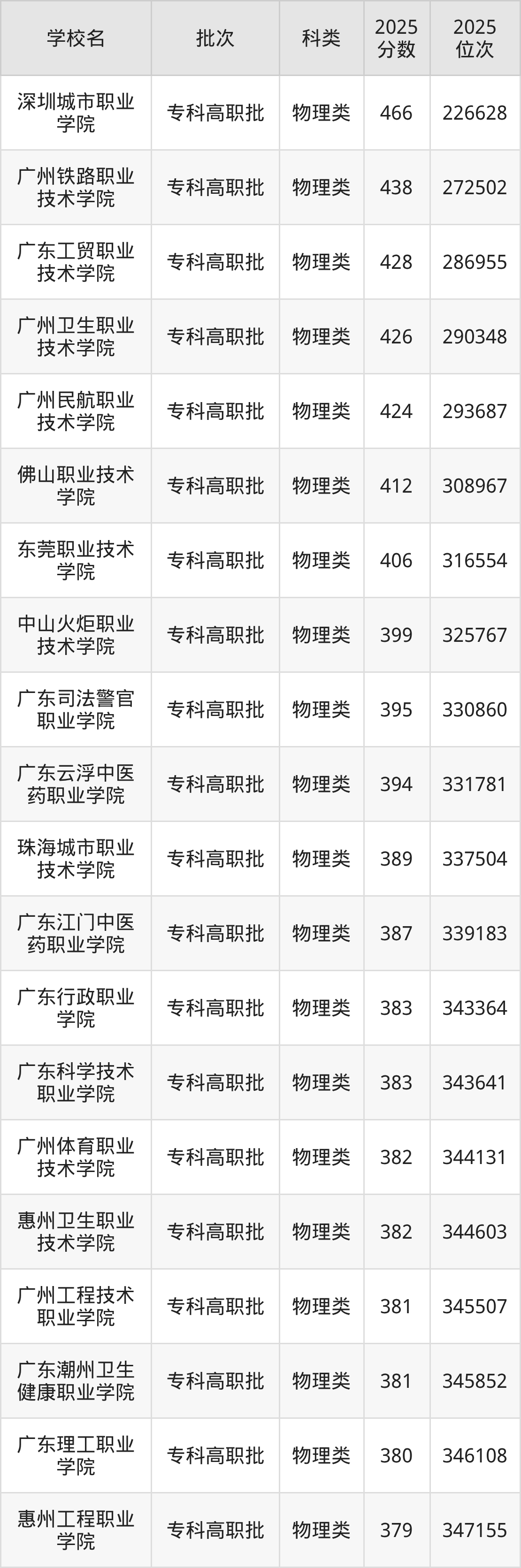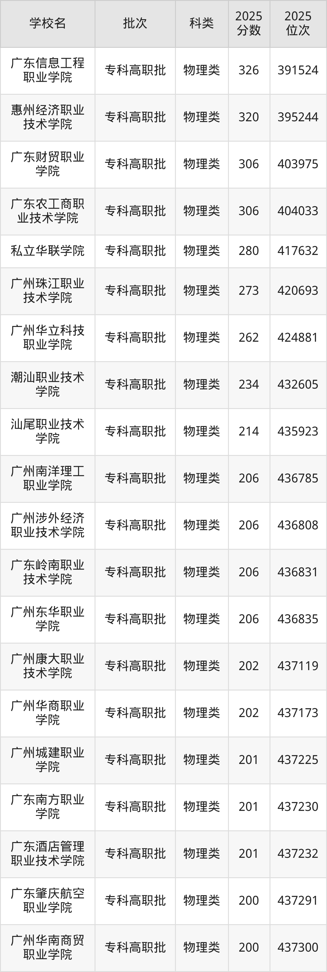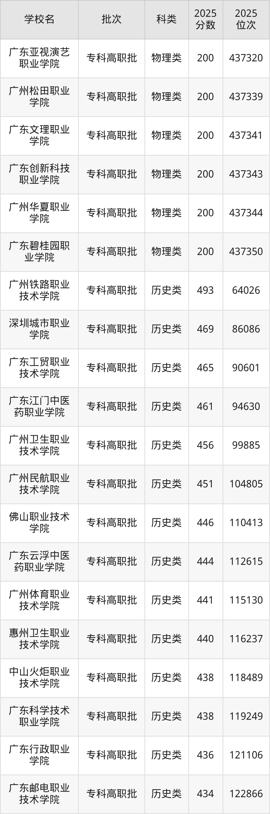 下面是2025年全国专科院校在广东的最低录取分数线一览表: