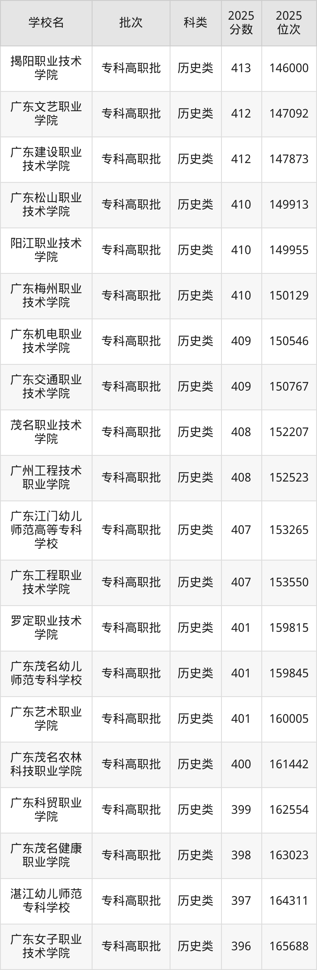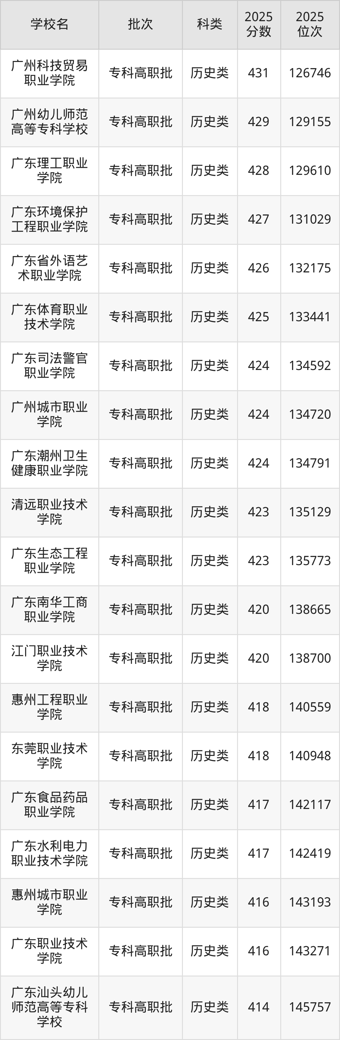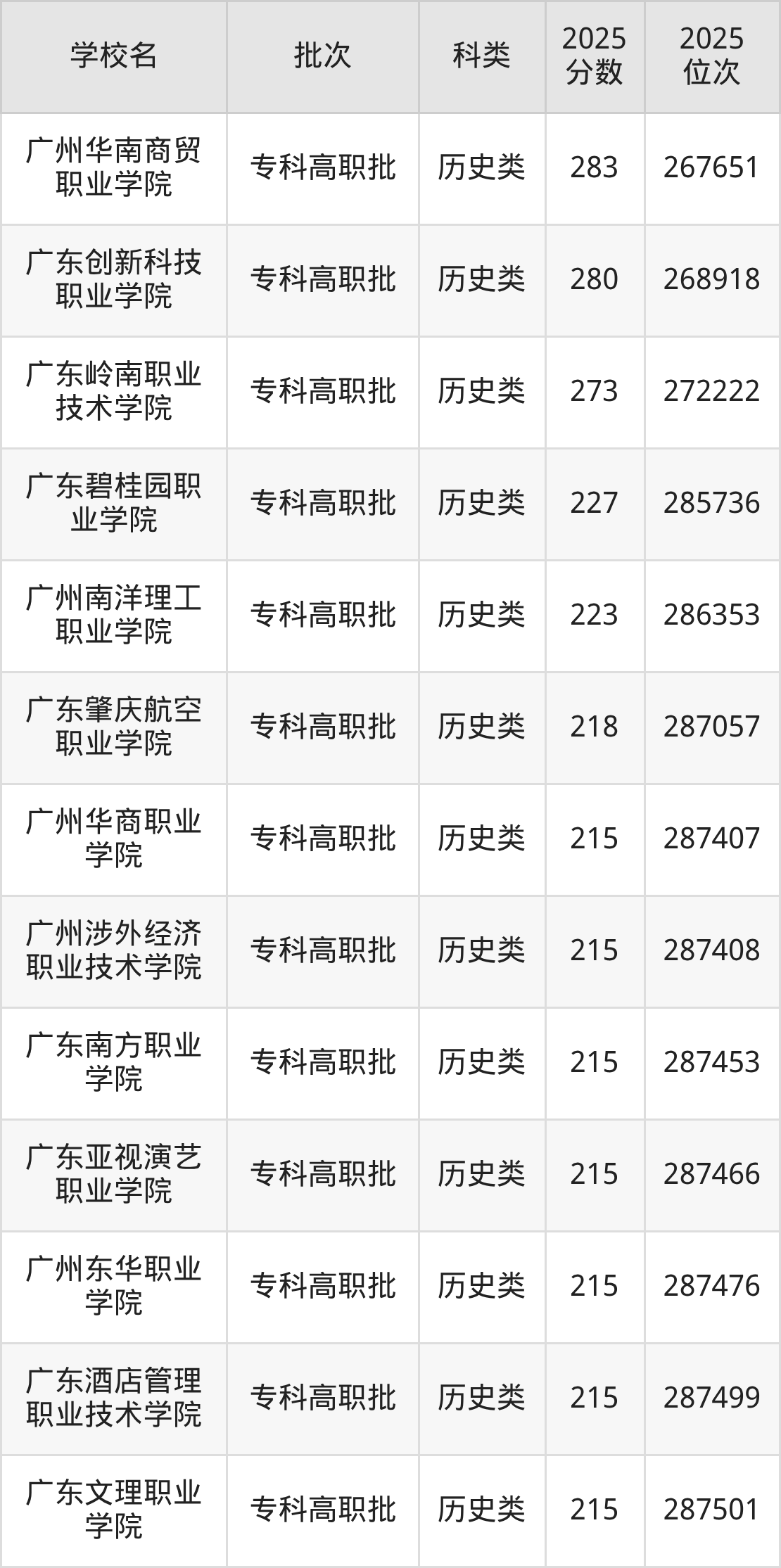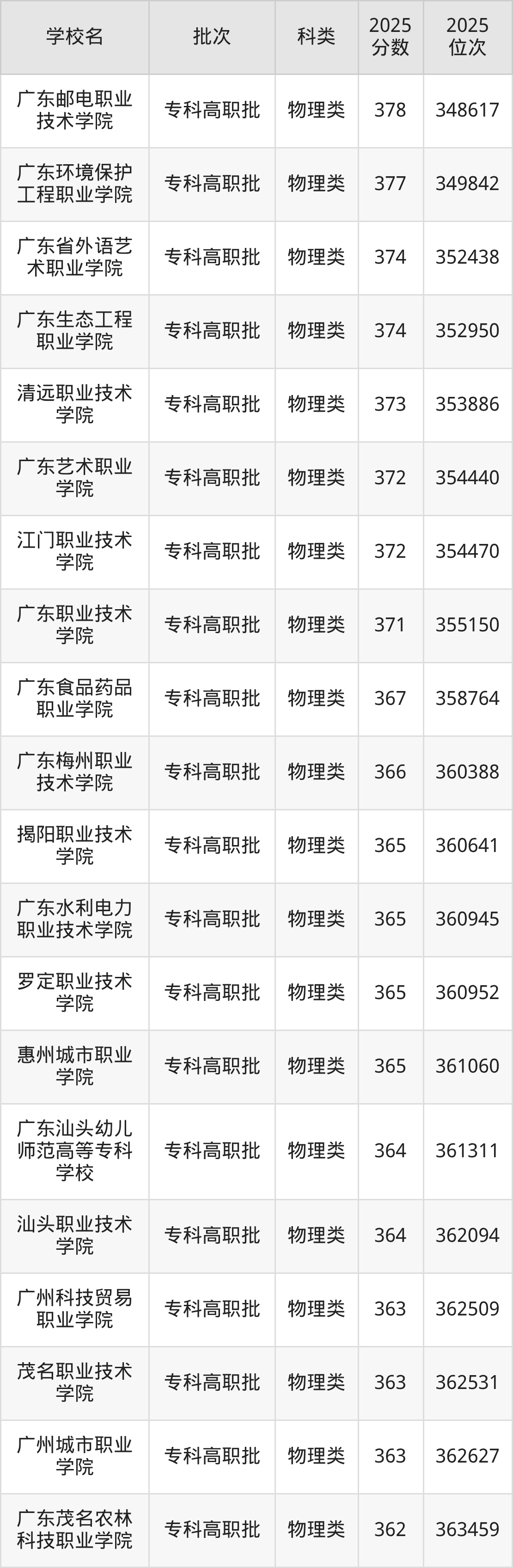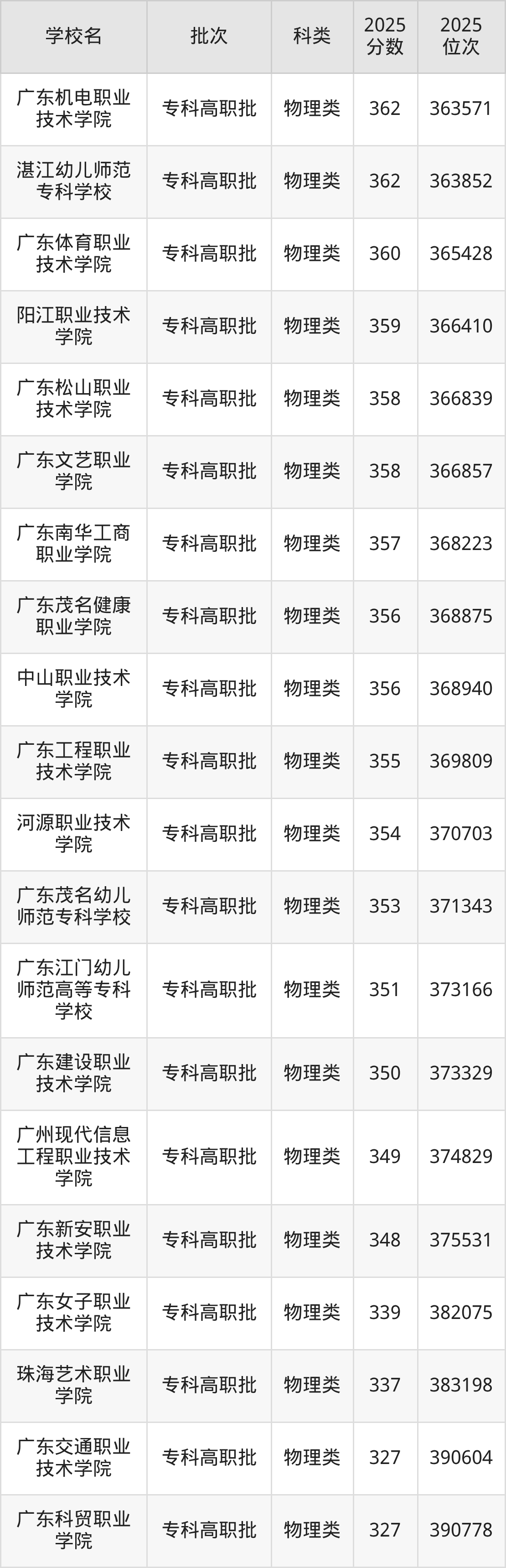下面是2025年全国专科院校在广东的最低录取分数线一览表: