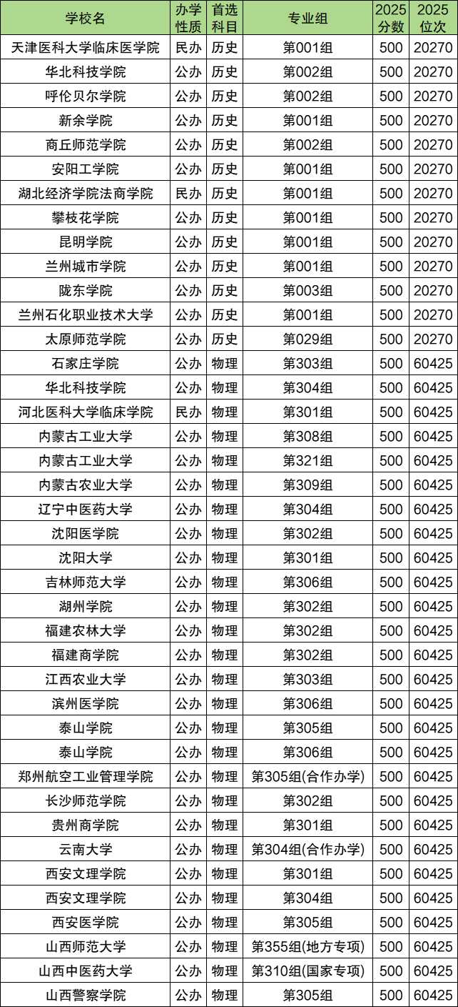 山西高考500分物理类位次是60425名,对应能上的学校有贵州商学院第301组、西安医学院第305组、山西警察学院第305组、江西农业大学第303组等;历史类500分位次是20270名,对应的大学有华北科技学院第002组、攀枝花学院第001组、兰州城市学院第001组、陇东学院第003组等,具体名单如下表所示: