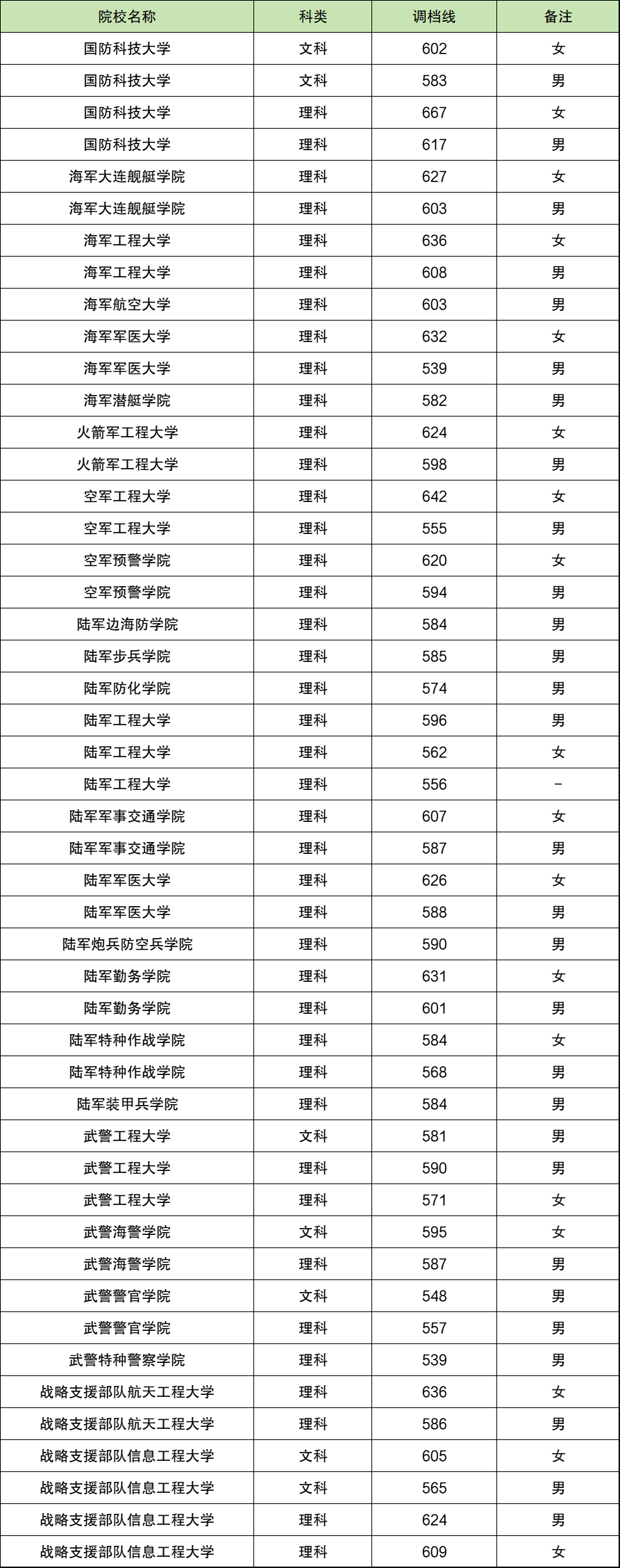 在招收男生的军校中,文科投档分数线最高的院校是国防科技大学,2024年分数线是583分;投档分数线最低的院校是武警警官学院,2024年分数线是548分。