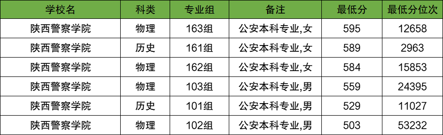 陕西警察学院主要面对的是陕西省的考生,在陕西警察学院的录取中,女生物理类公安专业的最低分数是584分,女生历史类的公安专业最低分数是589分;男生物理类的公安专业最低录取分是503分,男生历史类的公安专业最低录取分是529分。