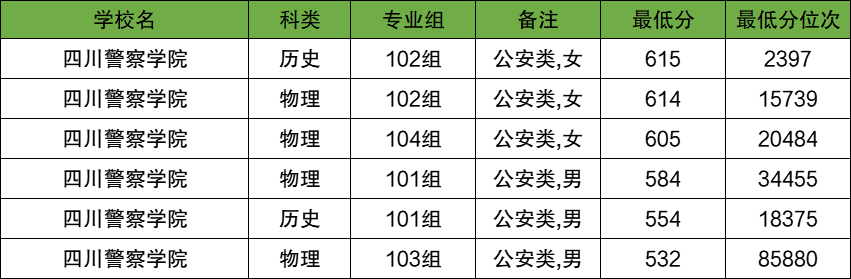 四川警察学院主要面对的是四川省考生招生,在四川警察学院的录取中,女生物理类的公安类专业录取分是605分,女生历史类的公安类专业录取分是615分;男生历史类的公安类专业最低录取分是554分,男生物理类的公安类专业最低录取分是532分。
