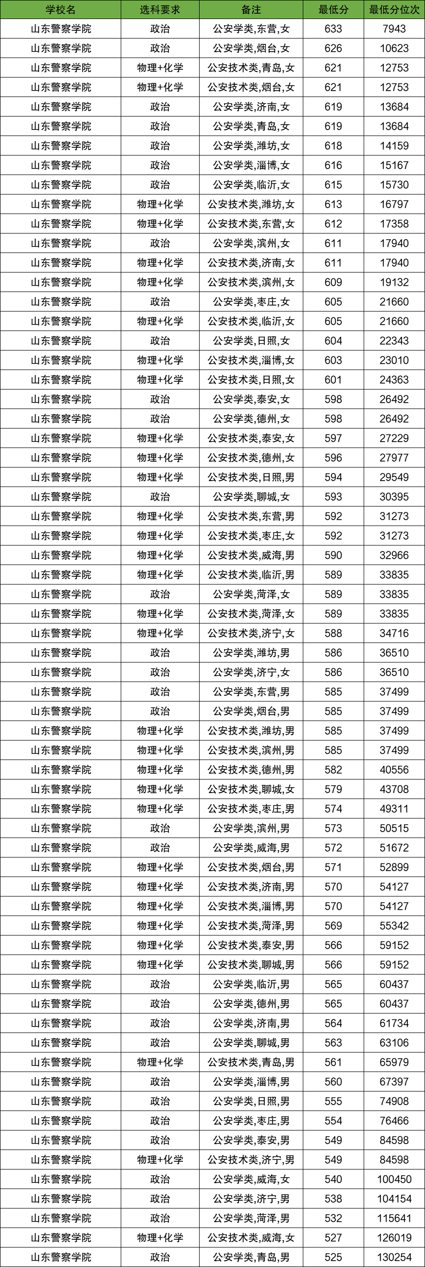 山东警察学院主要是面对山东省考生招生,在山东警察学院的录取中,女生中分数最高的是公安学类(东营)633分,分数最低的是公安技术类(威海)527分;男生中分数最高的是公安技术类(日照)594分,分数最低的是公安学类(青岛)525分。