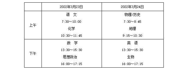 3月23日:上午7:30-10:00语文,10:30-11:45化学;下午13:00-15:30数学,16:00-17:15思想政治