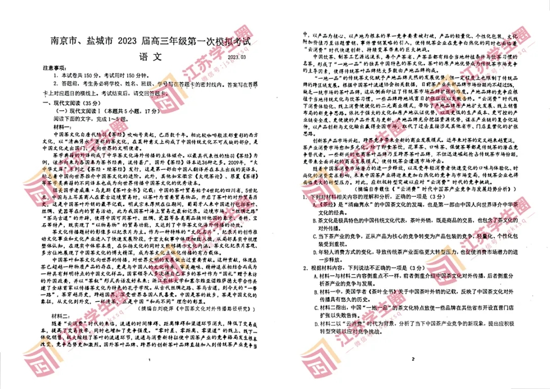 一.2023南京二模语文试题及答案