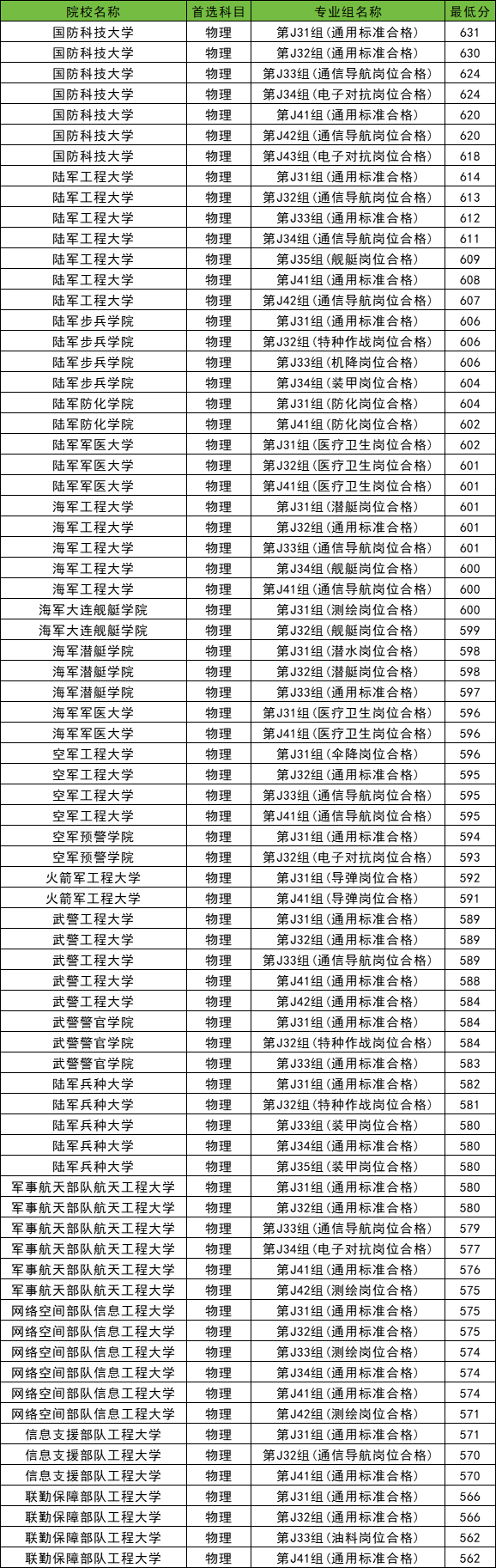 2025年各军校在江西物理类录取分数线最高的是国防科技大学第J31组(通用标准合格),2025年最低投档线631分;录取分数线最低的是联勤保障部队工程大学第J41组(通用标准合格),2025年投档最低分均为562分。