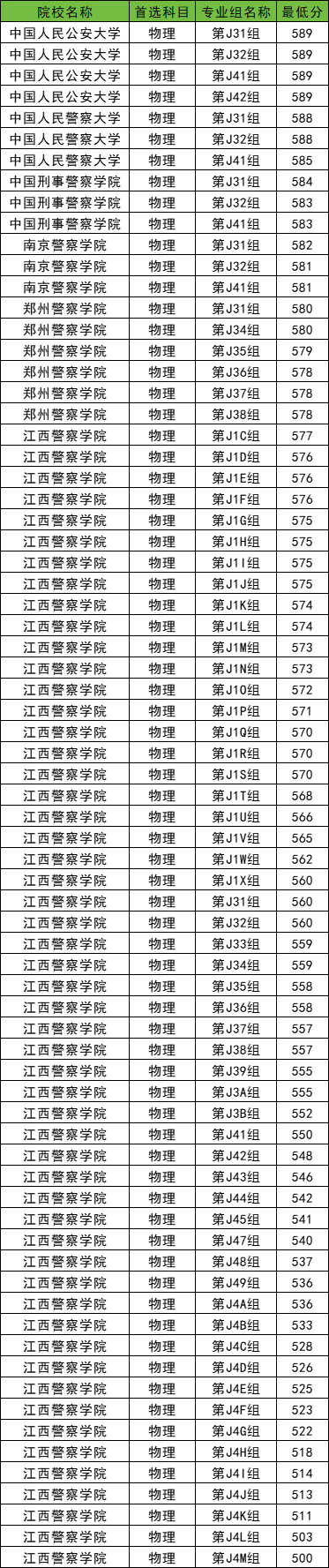 2025年江西警校物理类录取分数线在500分-589分之间,录取分数线最高的是中国人民公安大学第J31组,2025年投档最低分为589分;录取分数线最低的是江西警察学院第J4M组,2025年投档最低分均为500分。