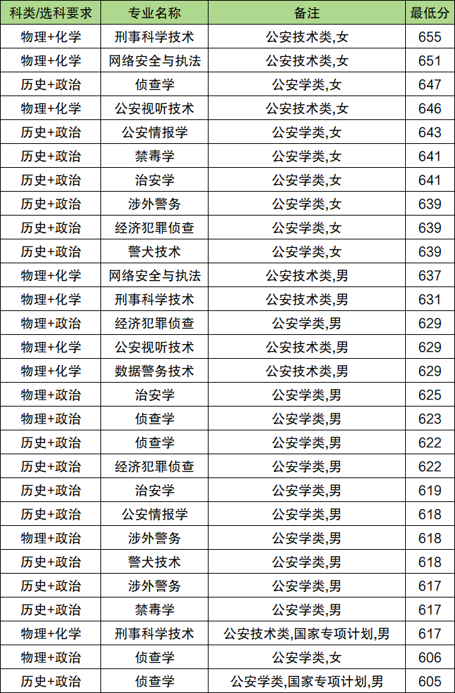 | 侦查学 | 公安学类,男 | 618 |