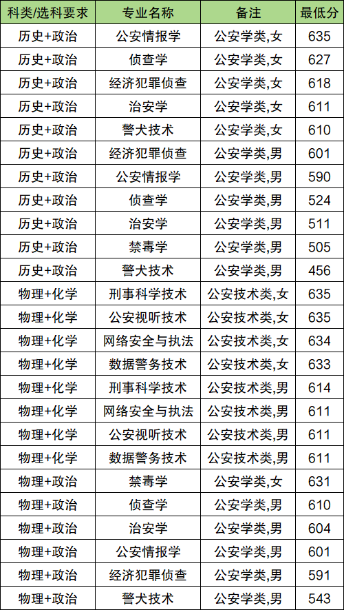 | 治安学 | 公安学类,女 | 636 |