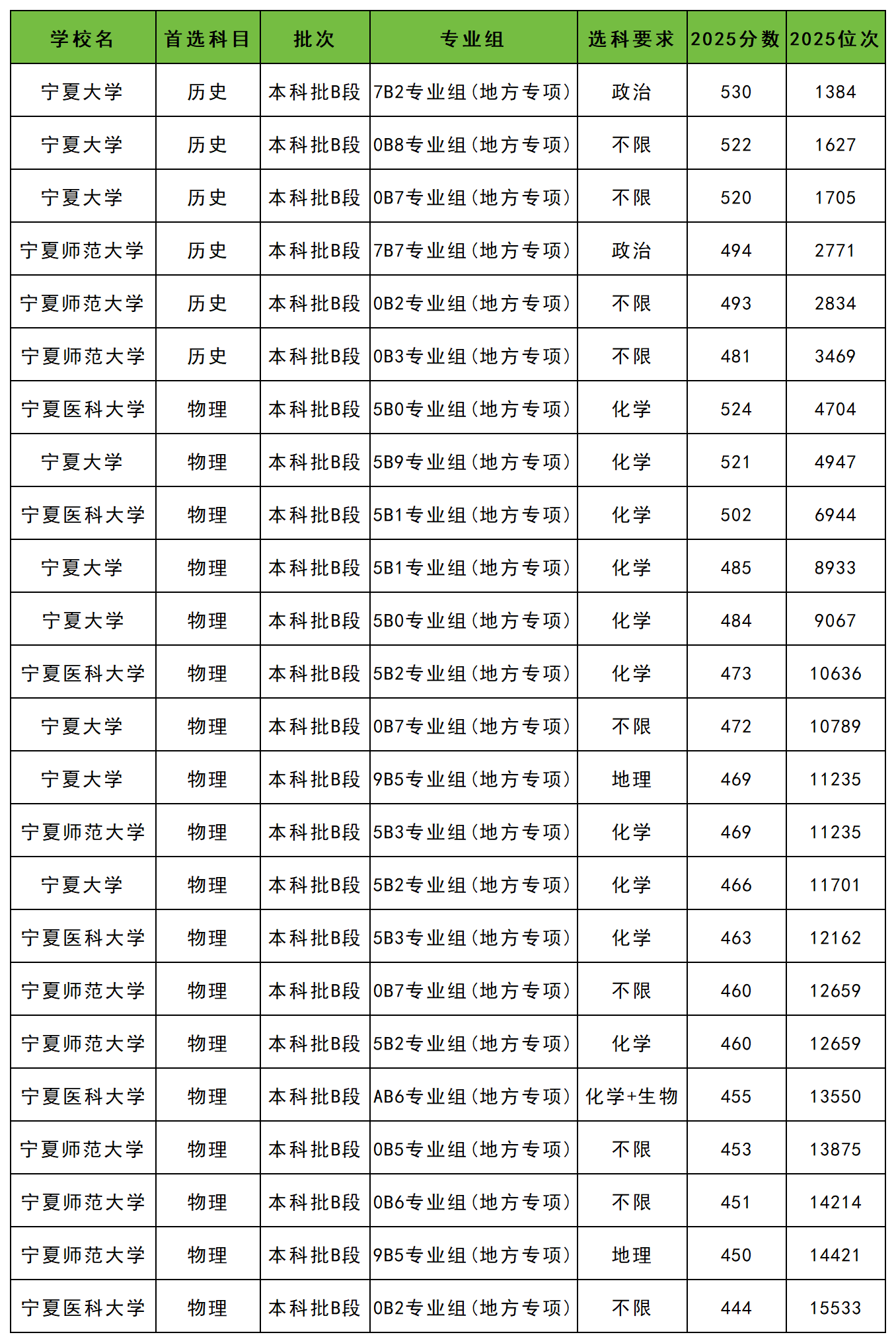 2025年宁夏地方专项计划最低录取分数线:历史类481分、物理类444分。