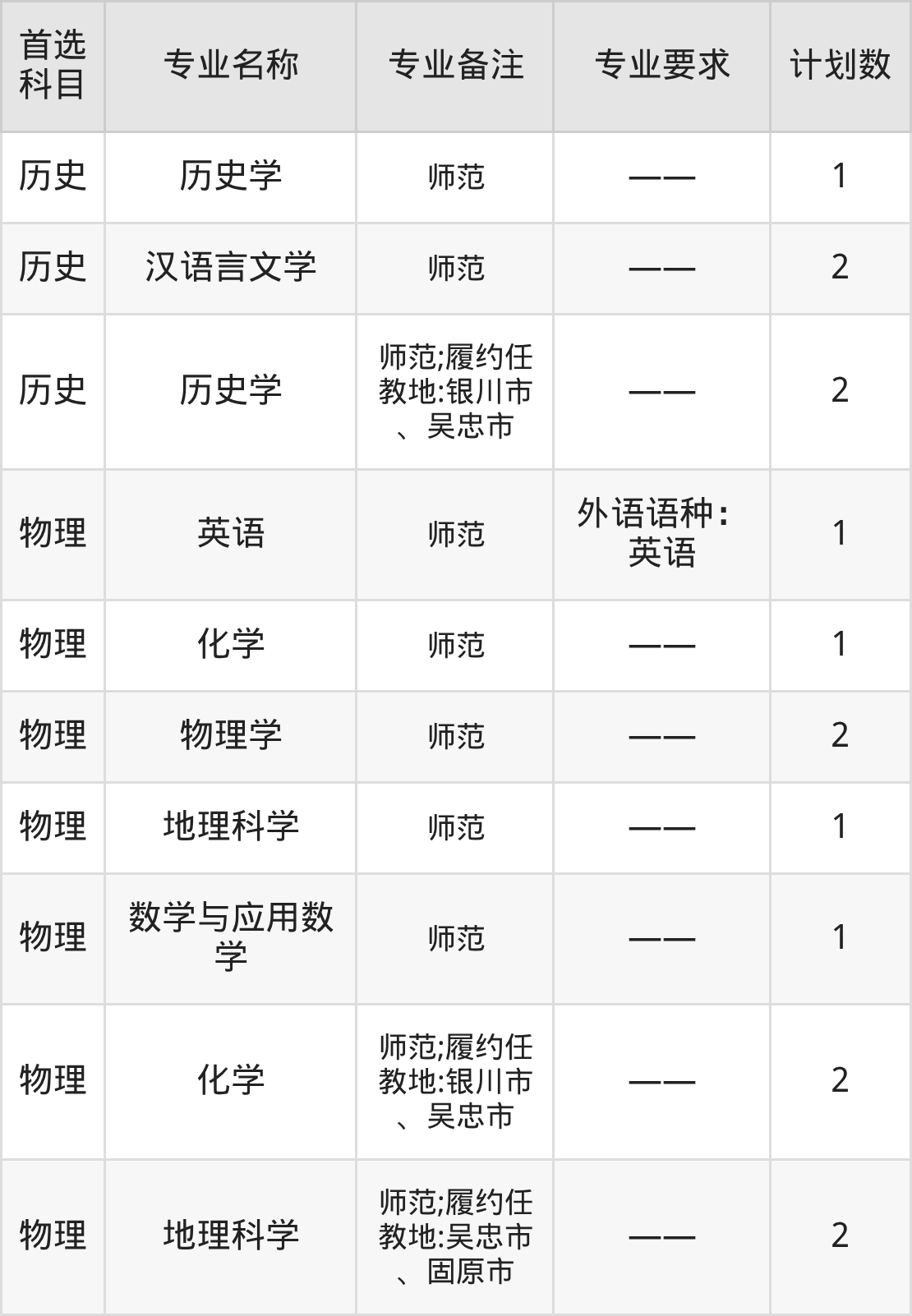 2025年东北师范大学在宁夏招生人数是18人,招生专业包括汉语言文学、英语、思想政治教育、物理学、数学与应用数学、地理科学、化学、生物科学。具体如下图所示: