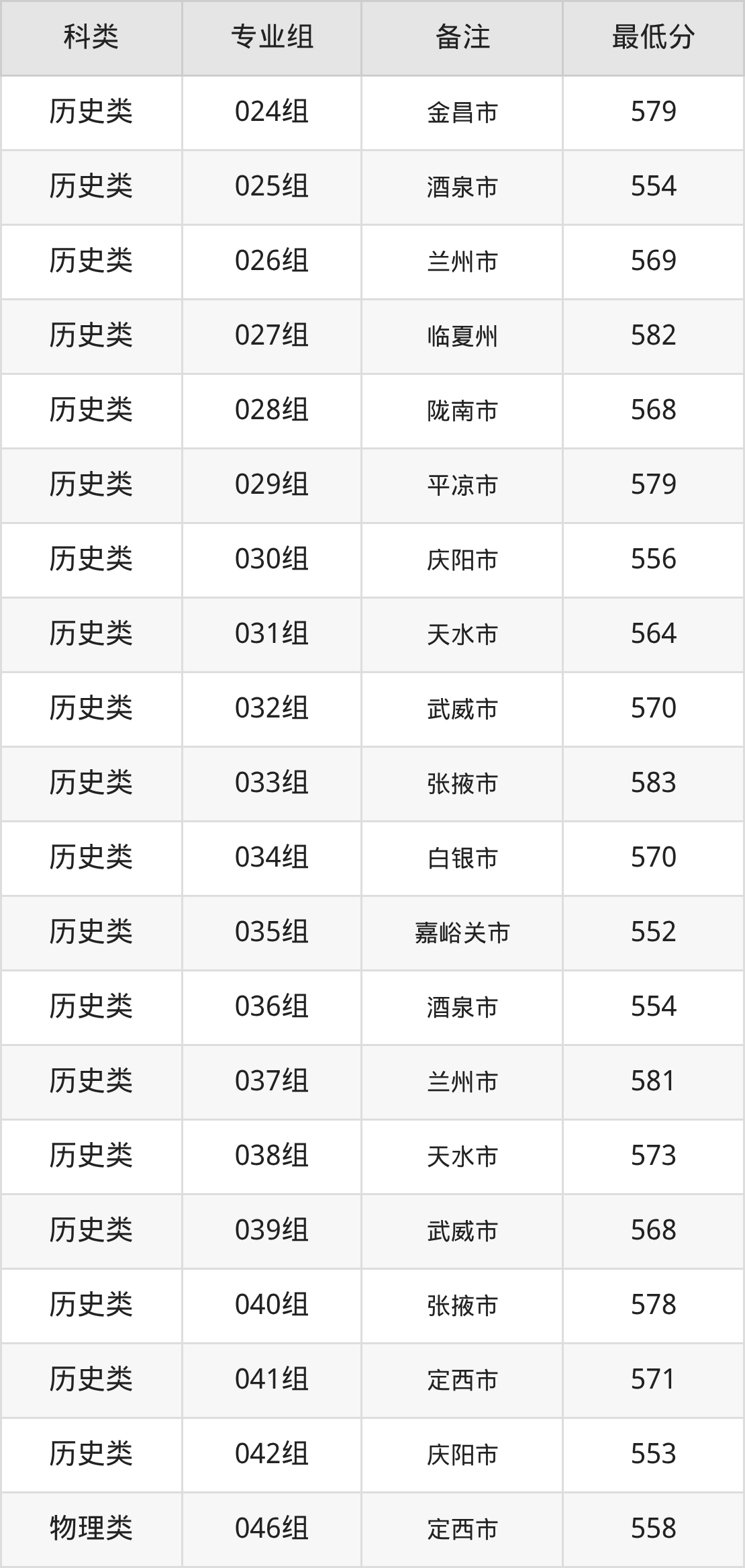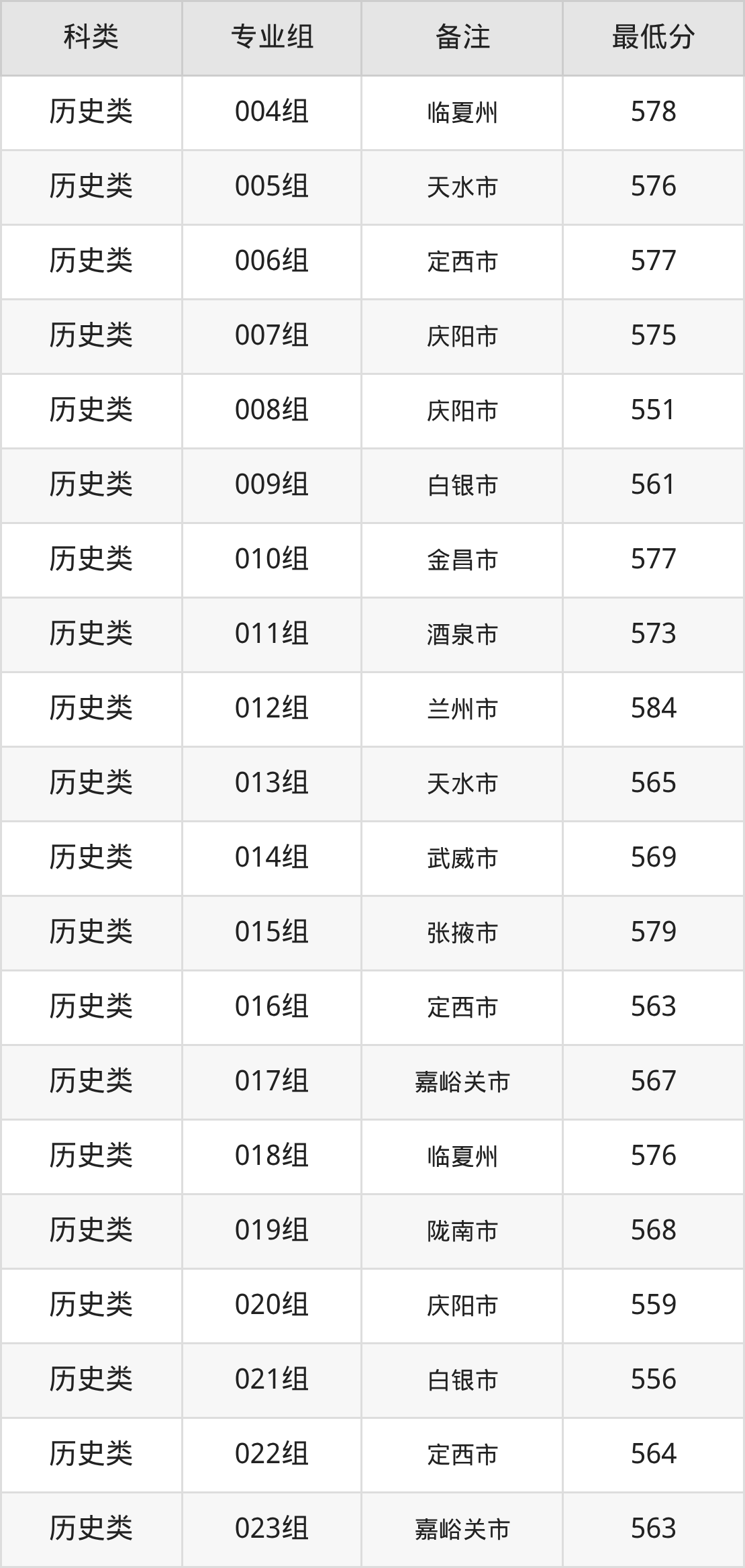甘肃历史组考生最难考的是012组(兰州市),2025年最低分584分,超学校该类最低分(551分)33分。最好考的则是008组(庆阳市),2025年最低分是551分。