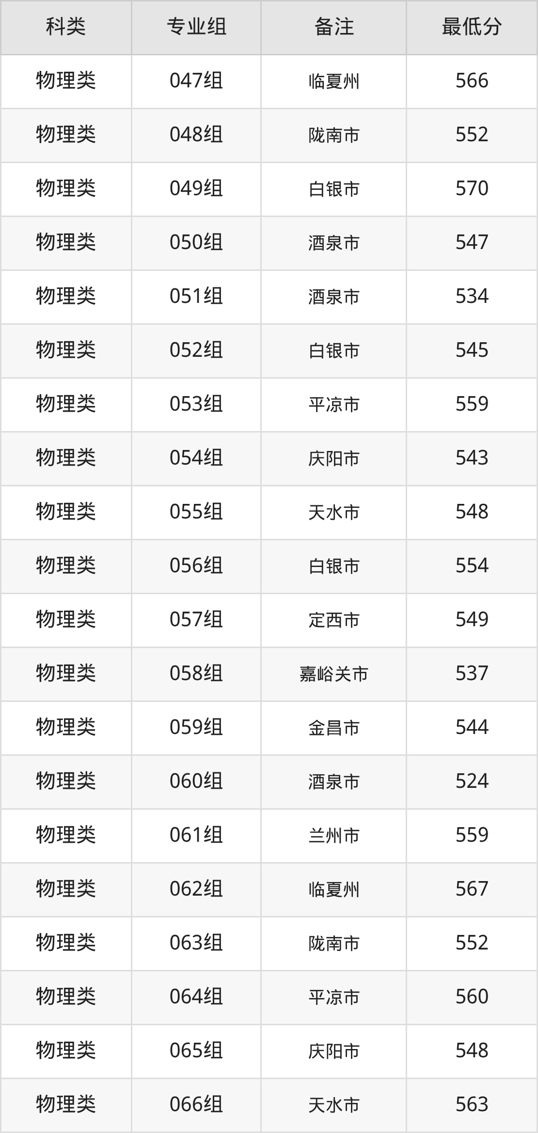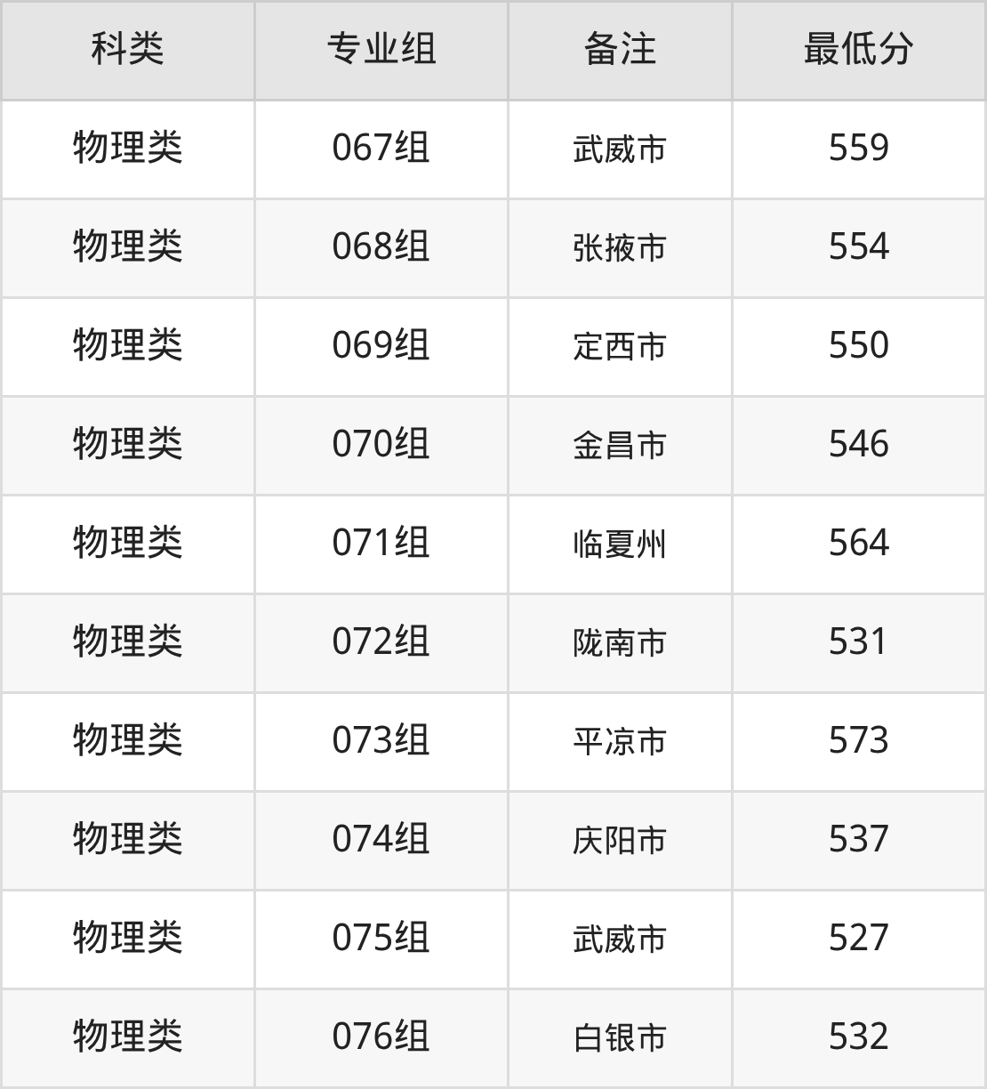 甘肃物理组考生最难考的是073组(平凉市),2025年最低分573分,超学校该类最低分(524分)49分。最好考的则是060组(酒泉市),2025年最低分是524分。